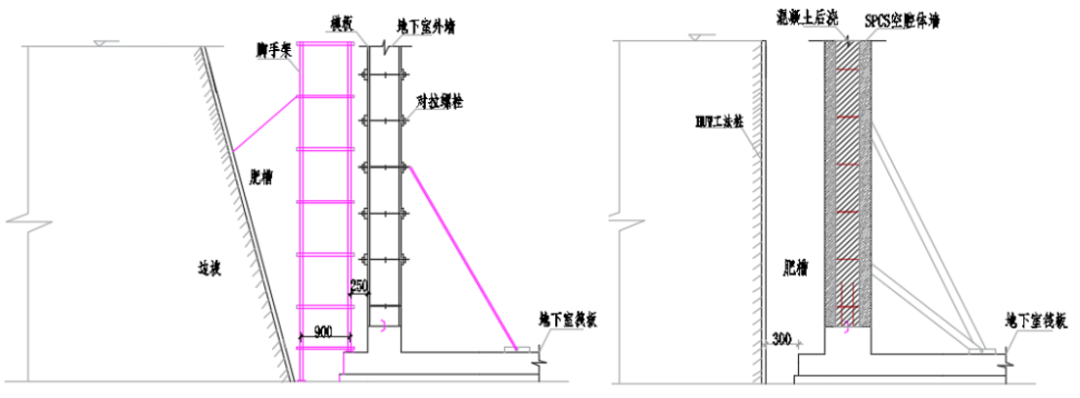 传统地下室,外墙与边坡间距为800~1000mm,土方开挖及回填方量大成本高;采用SPCS结构体系,外墙与边坡间距可缩小为300~500毫米,回填方量少成本低。
