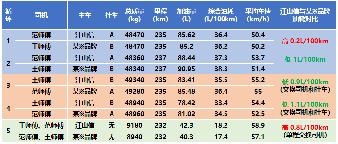 比武双方总重量、里程、加油量、综合油耗、平均车速、百公里油耗等一览无遗。其中,第4次测试江山·信465百公里油耗比某※品牌低1.1L/100km,而第1次测试则比某※品牌稍稍高0.2L/100km。