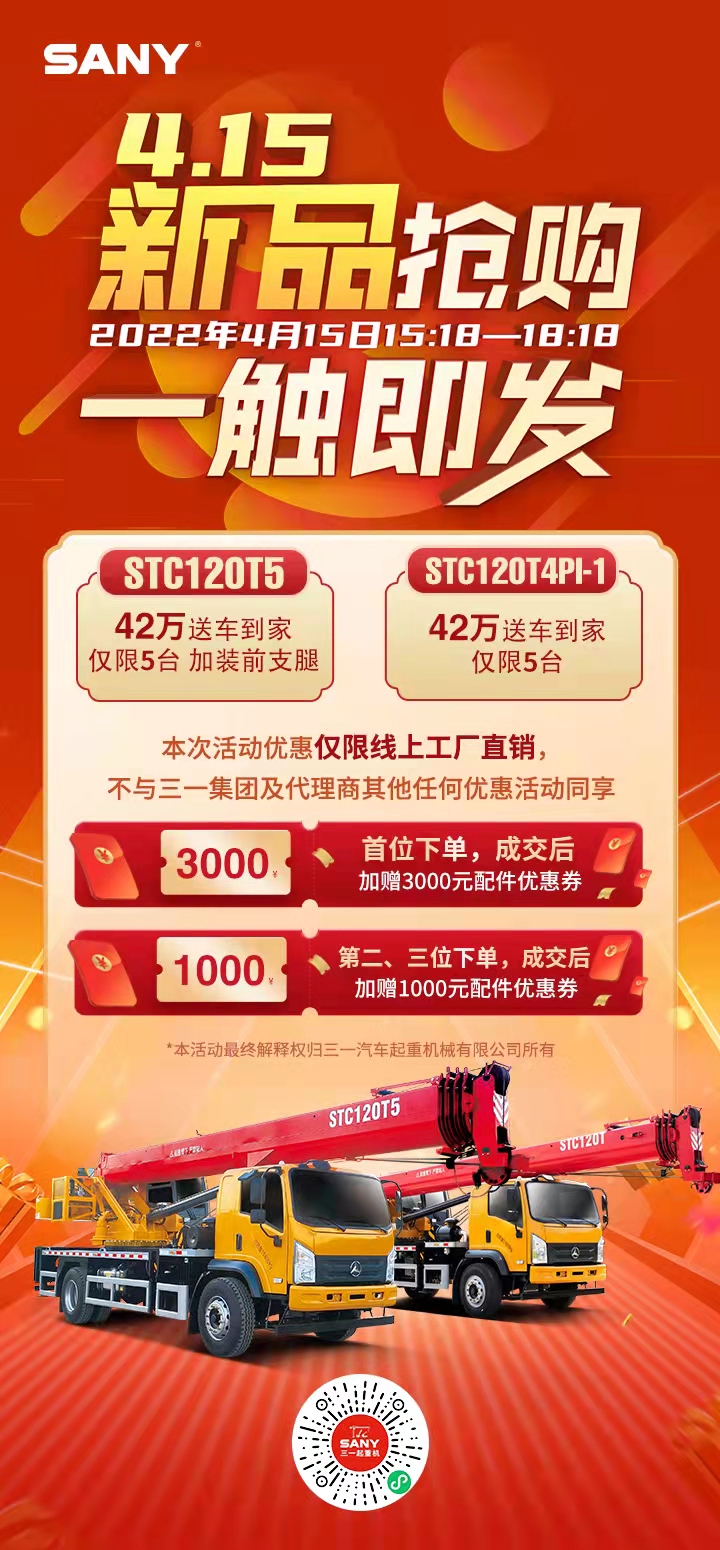 2022年4月15日下午15:18-18:18,好体育投注官网易起购小程序惊喜钜惠。5台STC120T5、5台STC120T混动版限时限量开抢。
