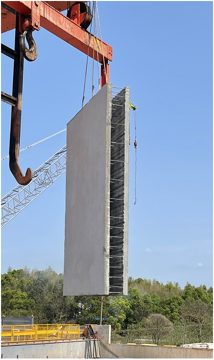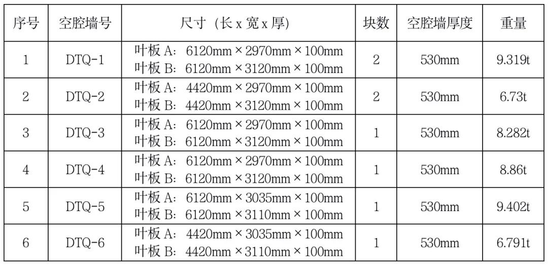 本项目SPCS系统方案具有以下特点: 1、该项目采用的空腔预制墙混凝土与钢筋一次成型,构件内部形成空腔,空腔内部浇筑混凝土。其中最重的空腔预制墙构件为9.402t。最大构件尺寸为6120mm×3120mm×530mm,空腔预制墙厚度均为530mm,内外叶板厚度分别为100mm。空腔预制墙构件具体信息见表1: