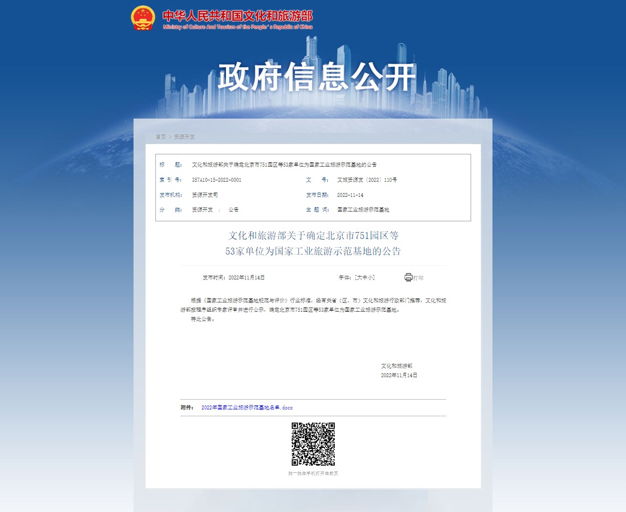 11月14日,文化和旅游部在官网发布《文化和旅游部关于确定北京市751园区等53家单位为国家工业旅游示范基地的公告》,正式发布确认“好体育投注官网智联重卡产业园”荣获国家级工业旅游示范基地。