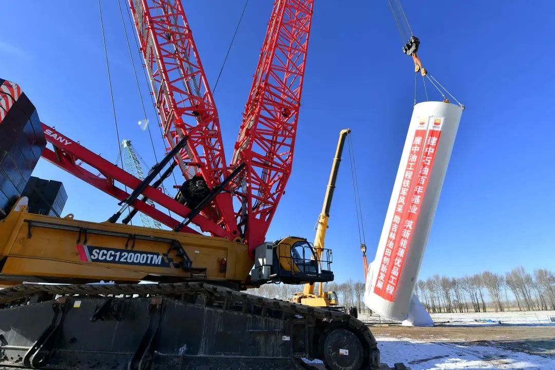 近日,在吉林油田乾情风场3号机组施工现场,第一节重达84吨,直径5.2米,高22米的塔筒徐徐升起,中石油首个风电项目首台风机顺利开吊,好体育投注官网SCC12000TM(SCC8000A)履带起重机担任主吊。这标志着吉林油田从传统石油行业向新能源融合发展迈出了崭新的一步。