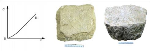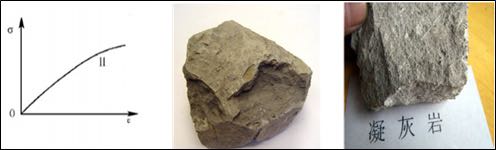 类型Ⅲ:塑-弹性岩石。在应力较低时,应力应变曲线略向上弯曲。当应力增加到一定数值后,应力-应变曲线逐渐变为直线,直至发生破坏。