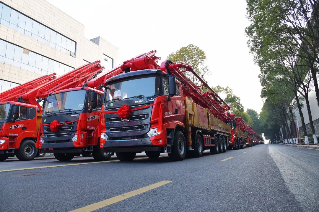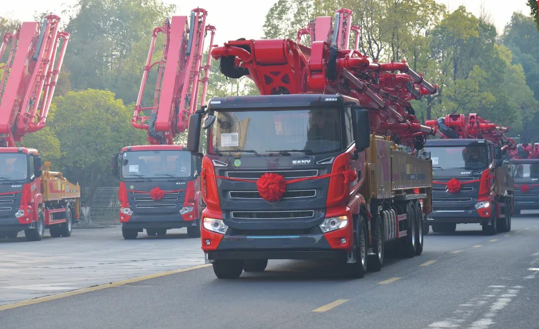 长沙厂区主干道上,66台“世界泵王”整装待发,接受现场各位领导和来宾的检阅。本次发货的产品涵盖37米、43米、56米等多款明星产品,更有S系列泵车的大力加持。