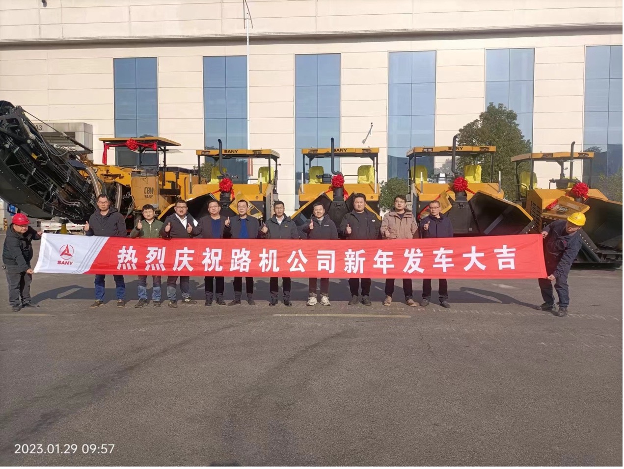 早上11点28分,益阳产业园新年首批摊铺机、铣刨机同时发车,浩浩荡荡驶出厂区大门,为兔年写下红火的开篇。