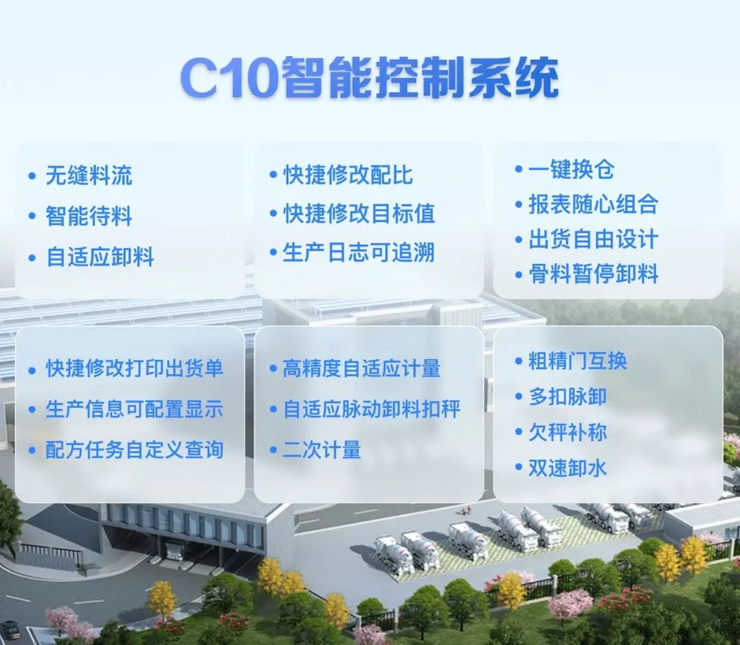操控更便捷 :为提升用户体验,C10智能控制系统操作系统新增多项控制技术:参数自适应技术,报表随心组合,多种快捷功能等(快捷换仓,一键生效,自动完成料仓切换,确保生产消耗准确记录)操作so easy!
