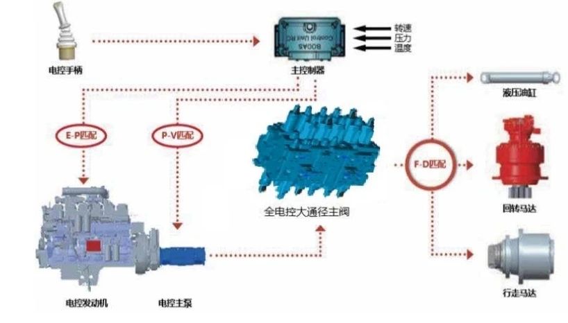 采用全电控集成匹配技术主要包括发动机与主泵、主泵与主阀匹配技术、流量分配技术、电控辅助技术、动臂无动力下放技术、独立油散水散控制。整机效率优于行业水平,油耗降低5-13%。