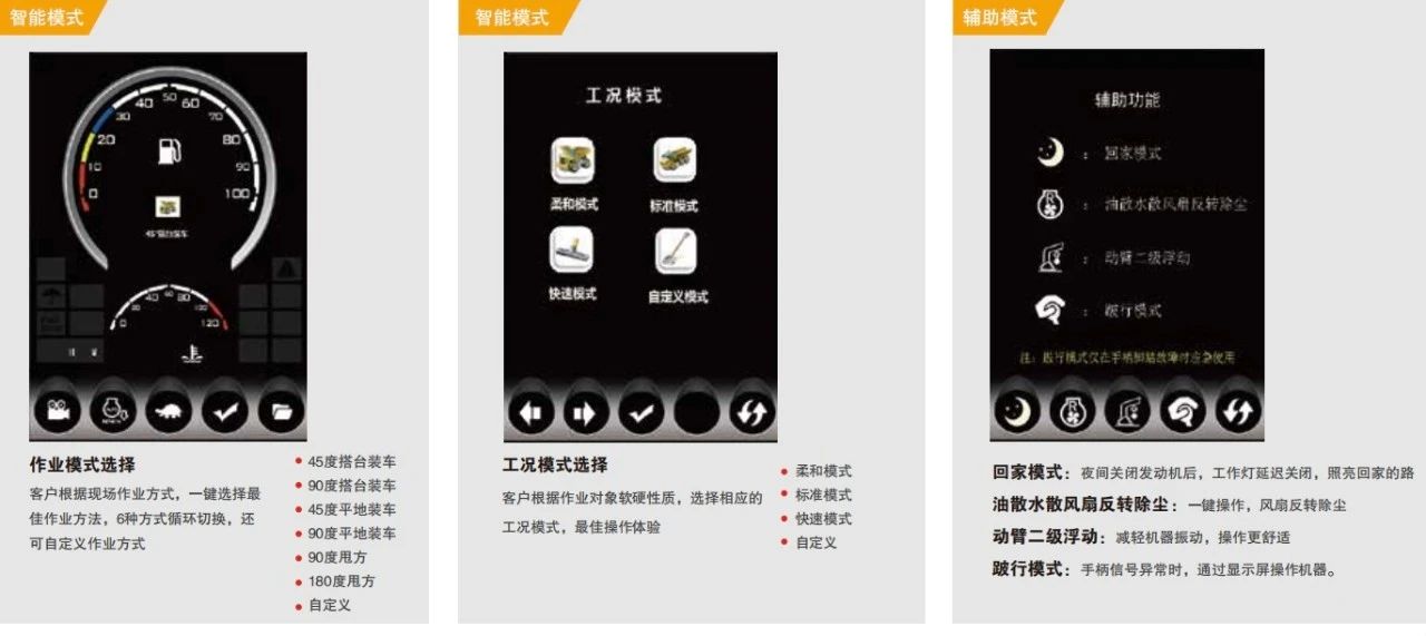 自动根据油、水温度智能调节风扇转速,优化热平衡温度及节能效果。怠速控制、保养时间及保养内容提醒、风扇反转除尘、动臂二级浮动、回家模式、跛行模式等辅助功能。