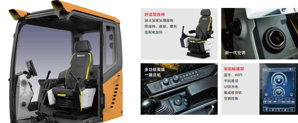 驾驶室内部采用智能操作系统,搭载10吋超大彩色触摸显示屏,作业模式、工况模式均可选择切换。实现高作业效率和燃油效率,环境和工况自动适应(高原自动调节泵与发动机的匹配)。