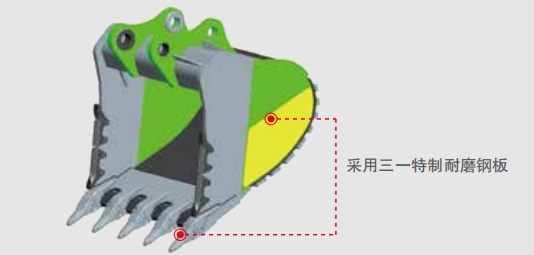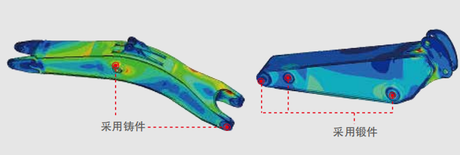 动臂、斗杆采用矿用型工作装置,关重支承部位采用整体铸件、锻件结构,斗杆挖掘力达495kN;大幅降低焊接应力集中及缺陷,提升工作装置寿命。