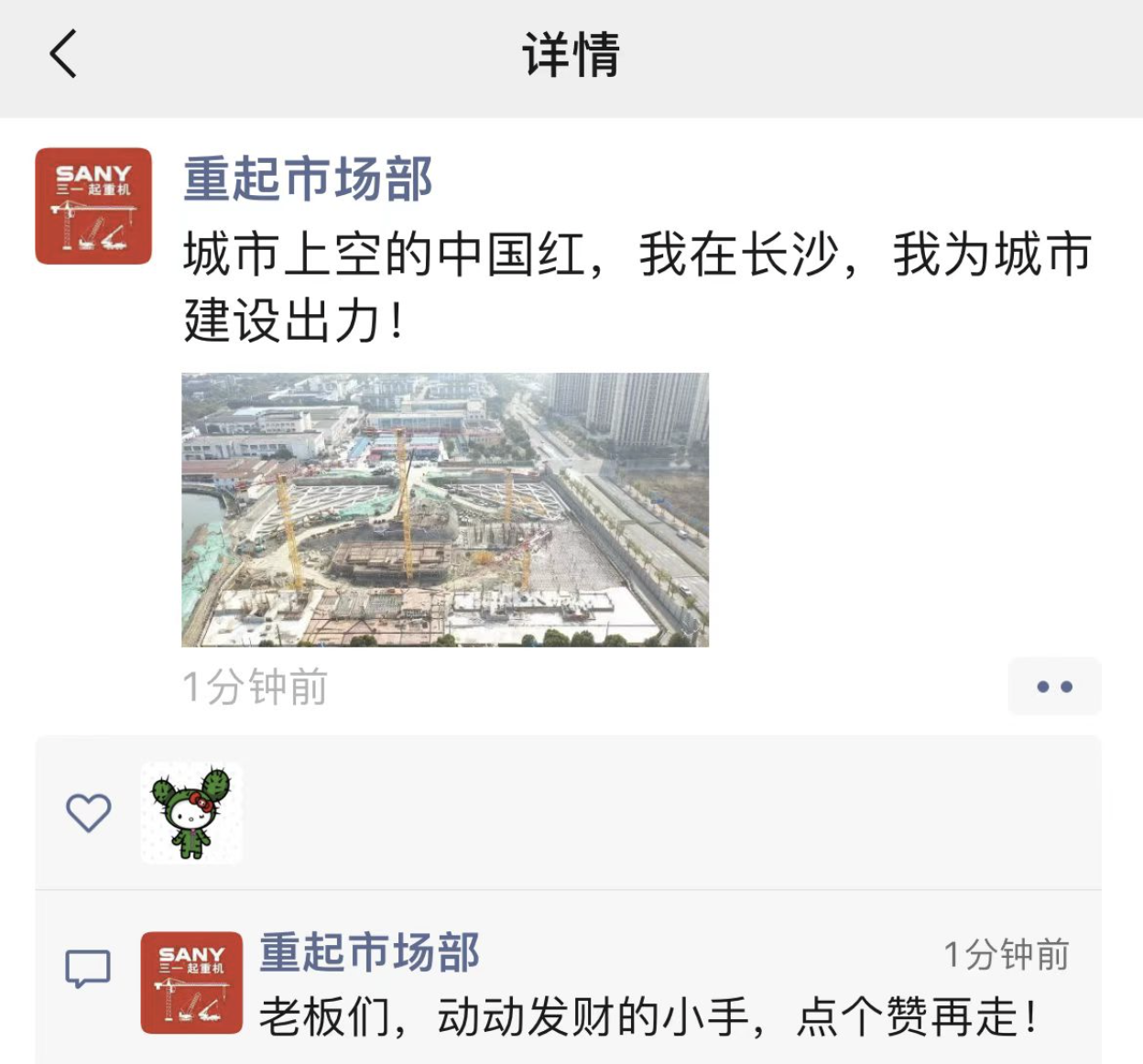 参与者将摄影照片分享至个人微信朋友圈,配文“城市长空的中国红,我在xx,我为城市建设出力”,集满31个赞后将发布截图私信发给“好体育投注官网塔式起重机”视频号,即可获得好体育投注官网定制文化衫。