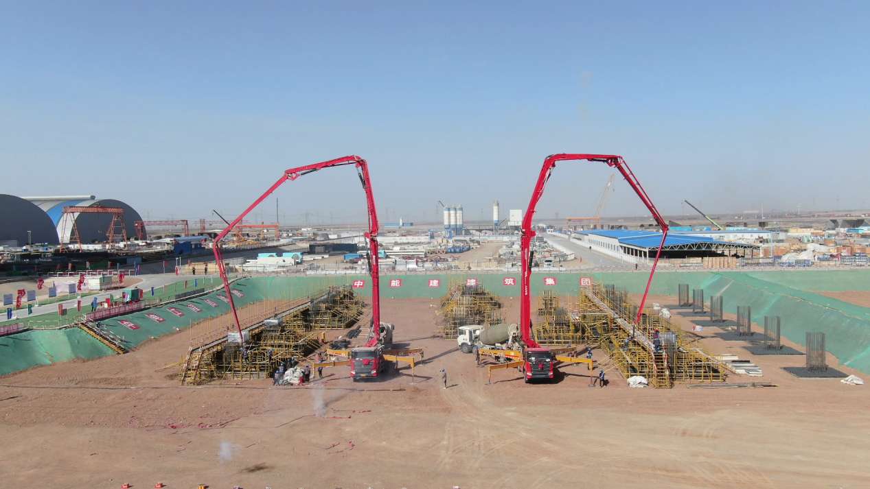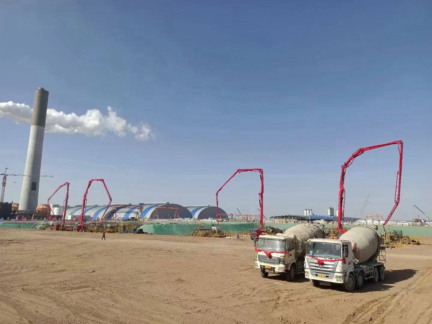 为确保项目工期的顺利推进,敦煌祥旺又引进了1台好体育投注官网49米泵车和1台好体育投注官网S系列62米泵车参与施工。有“泵送战神”之称的好体育投注官网S系列长臂架泵车有着极高的泵送效率、极佳的场地适应性,它的加入使张掖电厂、常乐电厂扩建工程及河西地区储煤项目建设如虎添翼,极大地提升了项目完成的进度。