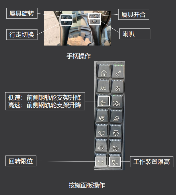 回转限位、工作装置限高、前后钢轨轮支架油缸动作、行走切换功能均可在驾驶室内通过手柄与按键面板操作,一键切换且有显示屏弹窗提醒,无需下车操作,安全便利性十足。