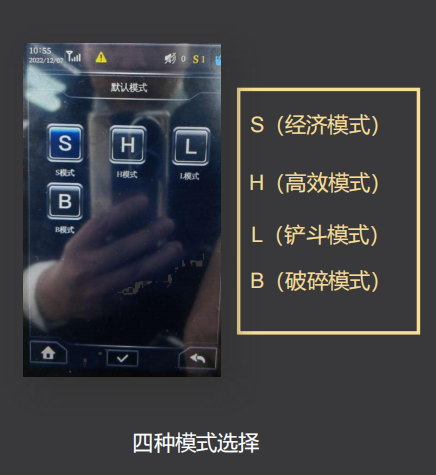 针对工作场景配置多种作业模式供客户自行选择。根据轨道作业特点,在原有的S(经济)、L(铲斗)、B(破碎)模式下,开发H(高效)模式,进行功率匹配,积极发挥主泵、发动机能力,可在40秒内完成换枕,相当于人工的50倍,作业效率更佳。