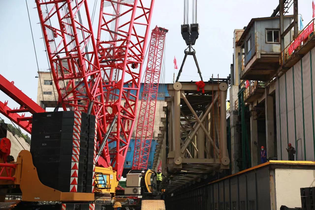 5月7日上午9时,吊装正式开始。SCC15000TM和SCC17000TM合力将重量440吨、长度120米的主桁架抬起绕过滑线,到达机侧推焦机轨道间上空,再带载行走,调整吊装姿态,稳定桁架。随后,SCC15000TM将配重增加至370吨,与SCC17000TM一起将桁架抬吊至炉顶的门型支架上,实现就位,完成吊装。