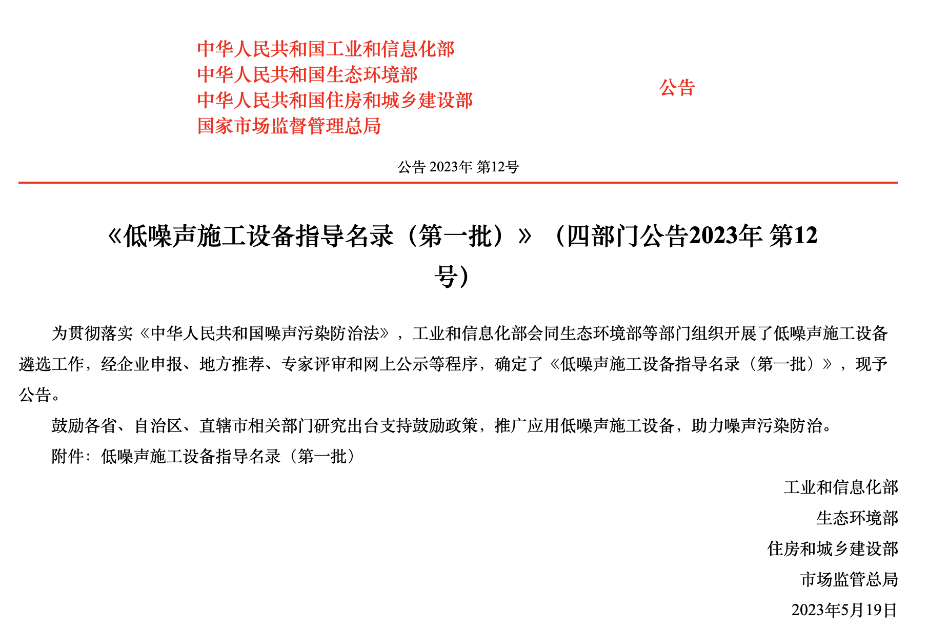 近年来,随着噪声污染问题日益突出、公众对噪声问题的日益关注,我国在噪声领域的污染防治攻坚行动正在加快。“低噪声施工设备认定”由工业和信息化部和生态环境部联合发起,旨在减少施工设备噪声污染,加快低噪声施工设备的研发和应用推广,引导施工设备技术进步,促进建筑施工设备行业高质量发展。