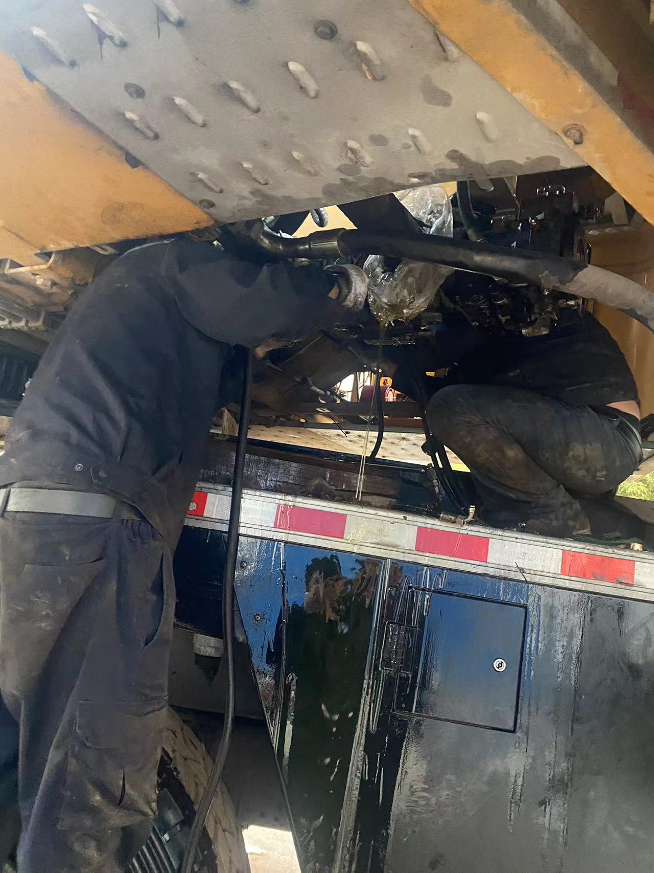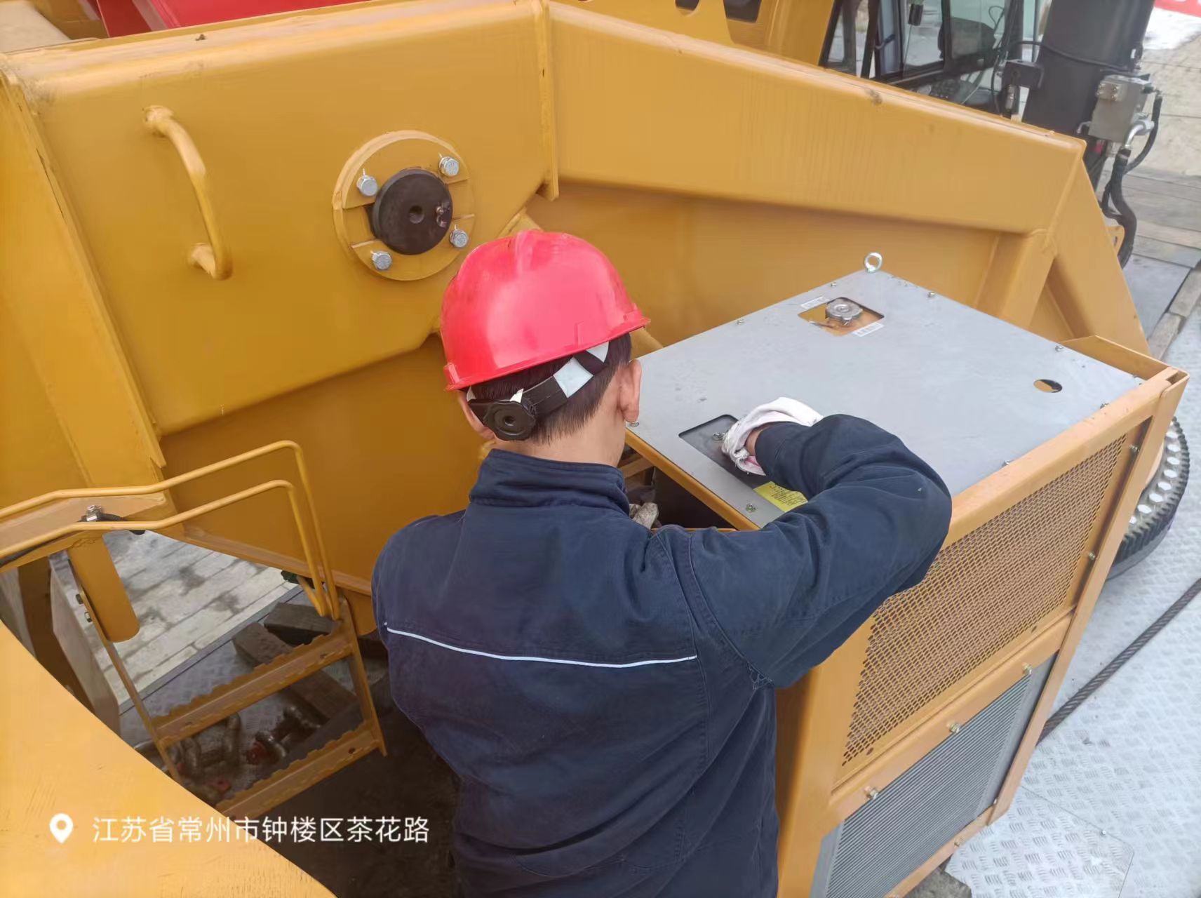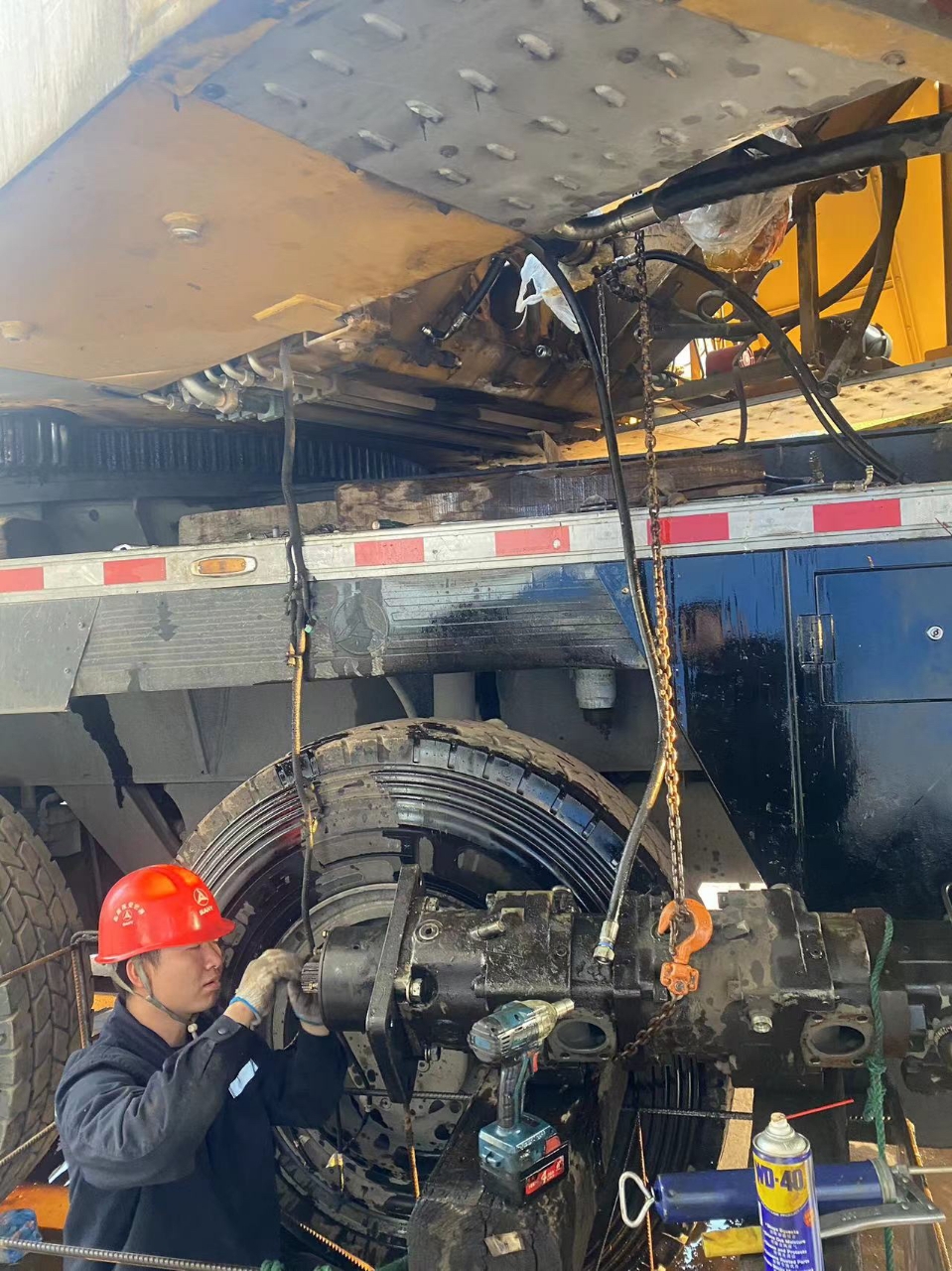 拆装油泵是一项力气活,李顺协调了另一位服务工程师金开华来帮忙。油泵重达50kg,而转台空间有限,只够一个人上去,李顺在上面也只能小幅度动作。拆装时液压油混合着汗水,在阳光的照射下渗入眼睛,好几次他都睁不开眼。两人仔细操作,相互配合,耗时一天完成了拆除和重新安装。经调试后,确认设备恢复正常,故障完全解除。