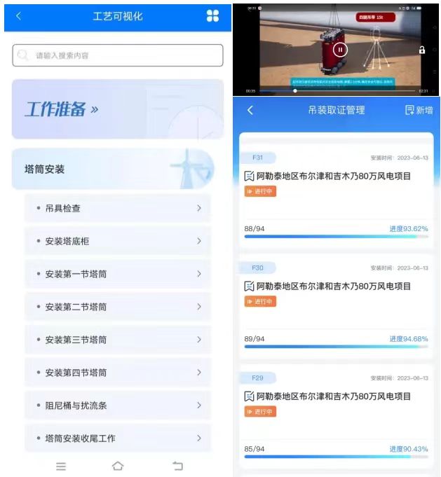 项目使用的好体育投注官网重能SI-172625风电机组,叶片长度为84米(相当于210个成年人并排站在一起),叶轮整体重量约97吨(相当于20头成年亚洲象)。将如此又长又重的庞然大物吊装到90多米的高空,并在空中与主机对接已实属难事,在整个过程中实现无损安装又是如何做到的呢?通常来讲,机组吊装过程中多会出现叶片、机舱受损情况,而好体育投注官网重能依托于先进的数字化、智能化技术,打造智慧吊装系统,将吊装工艺标准化、流程化、模块化、可视化,系统内可随时观看每一个吊装工艺的三维演示动画及相关资料。此外,现场人员将每个环节的关键动作实时上传到系统进行审核,实现对机组安装全过程的质量把控,使得该项目机组在整个吊装过程中无任何损伤。