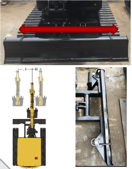 变形金刚,无所不能:SY16C底盘宽度可在980mm-1350mm之间任意变动,推土铲宽度可折叠,适应各种挖沟渠的场地。工作装置可左右偏转,左偏595mm,右偏350mm。两边都能轻松挖到履带外边缘,可在墙边墙角等空间限制位置作业。