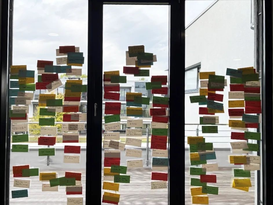各位嘉宾从Performance(作业表现),到Comfort(舒适性),一路再到CCC(连续压实控制)共计15个维度上,给出了自己对“优点”的需求,一个需求点就是一张小纸条,而本次QFD研讨会上,“优点”小纸条贴了满满一面玻璃墙,蔚为壮观。