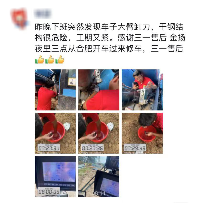 经过两个小时的检查维修,早上八点迎着太阳,设备的大臂缓缓抬起。看见故障解除,客户不断道谢:“设备急着开工,本来我都不知道要怎么办了,但你一来我就放心了。”