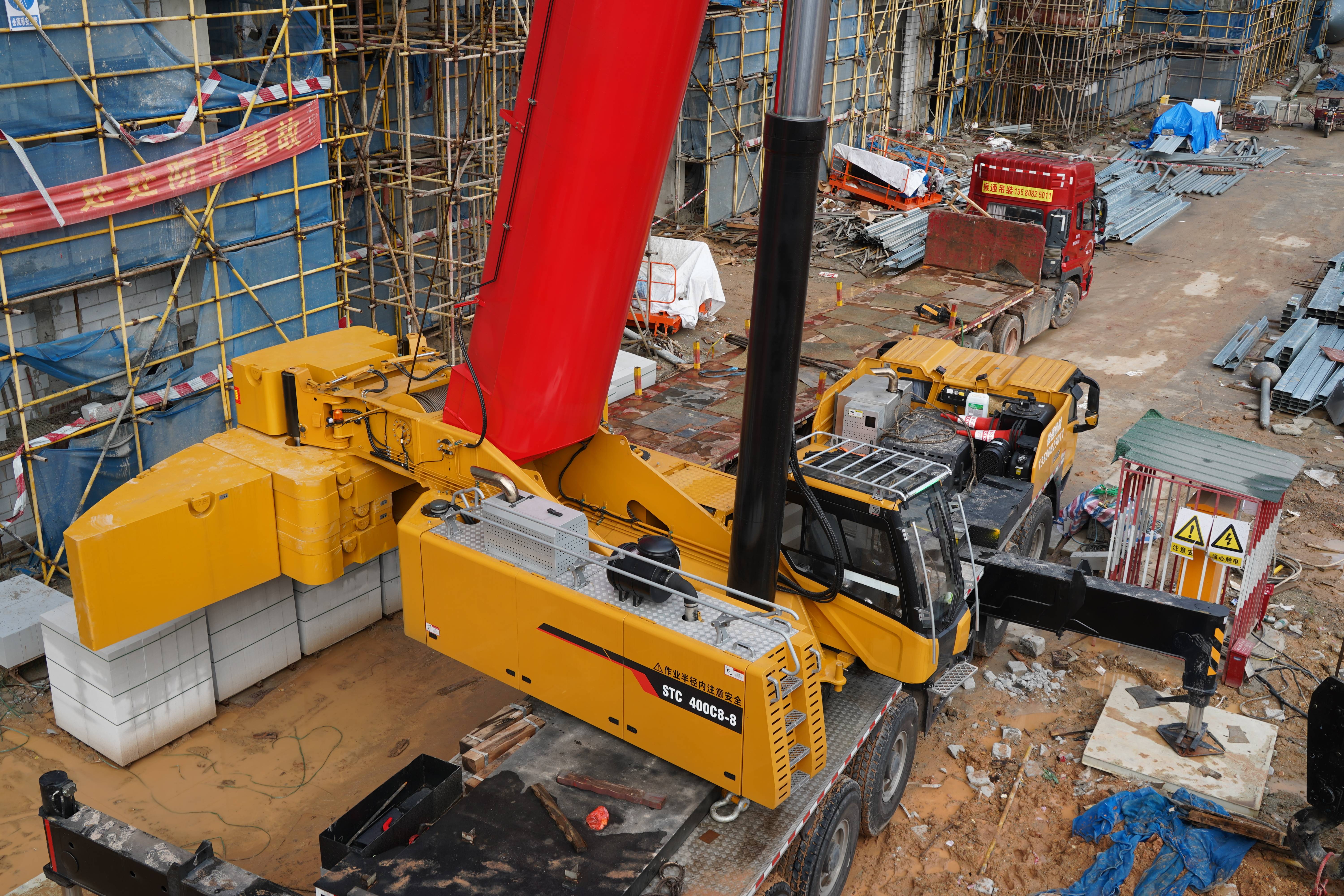 他说:“第一,这是行业首款240吨级的汽车吊,8节主臂全伸90m,最大臂长120.5m,起吊性能完全不输300吨级的吊车。第二,这台车更灵活,占用的场地空间更少。第三,吨位小一点,台班费也会低一些,这一定程度上能减少甲方的成本。”经过双方仔细斟酌后,STC2400C8-8进场了。