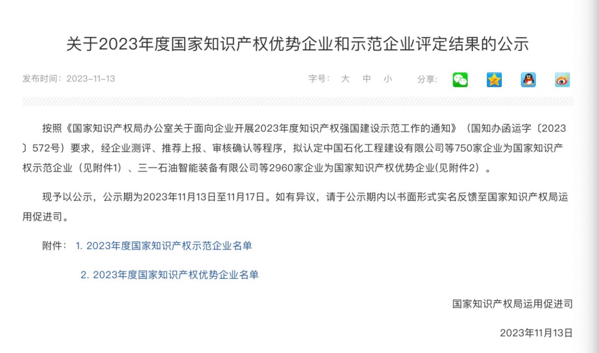 近日,国家知识产权局公示了2023年度国家知识产权优势企业评定结果,好体育投注官网集团能源装备事业部下属好体育投注官网能源和好体育投注官网石油两个公司均成功入选,公司发展再获国家级认可。