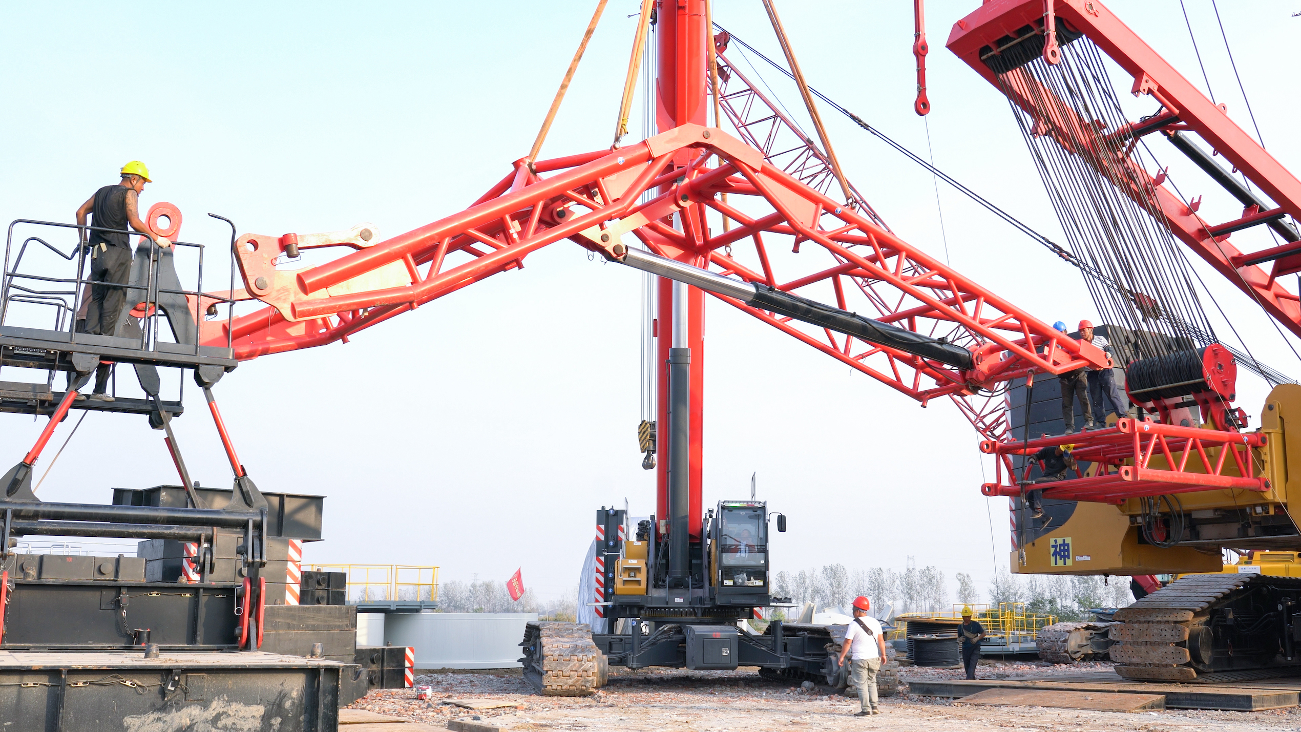 施工负责人徐先生说:“在STB1600T6进场之前,辅吊是两台桁架臂履带起重机,拆装主吊设备的配重时,这两台设备需要进行臂长的转换,而伸缩臂履带吊直接伸到合适的长度就可以吊装,一下就能省一个半小时。”