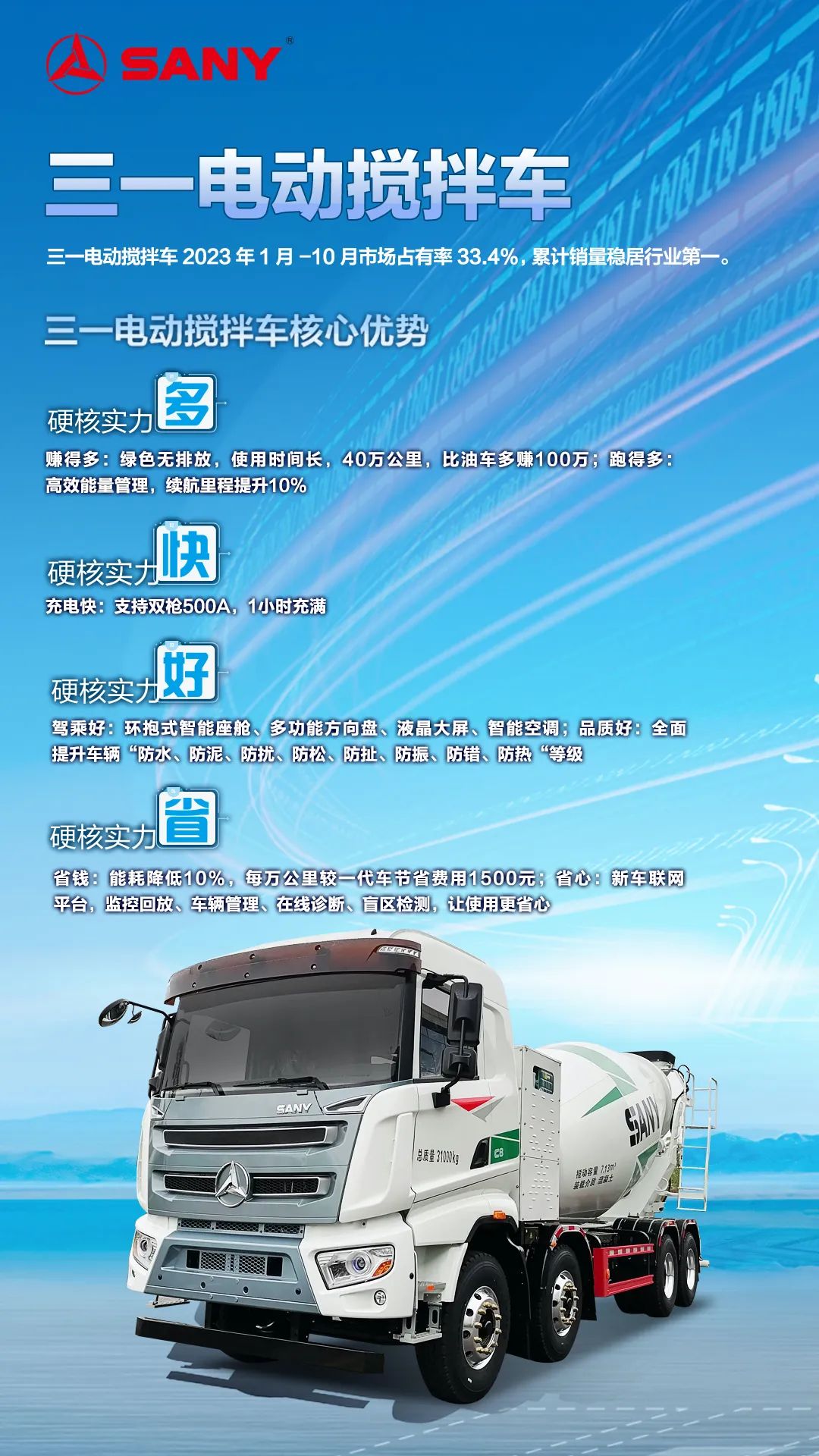 好体育投注官网电动搅拌车2023年1月-10月市场占有率33.4%,累计销量稳居行业第一。作为“能耗最低的电动搅拌车”,好体育投注官网电动搅拌车以高效节能、品质过硬、驾乘舒适、无忧服务获得用户青睐。支持双枪500A,充电仅需1小时;高效能量管理,续航里程提升10%;上装全电动直驱系统,能耗降低10%;自制专用底盘,一体化设计;新一代新能源专属智能座舱,颜值爆表空间大,视野开阔盲区小,智能空调,高端气浮座椅,舒适媲美乘用车。