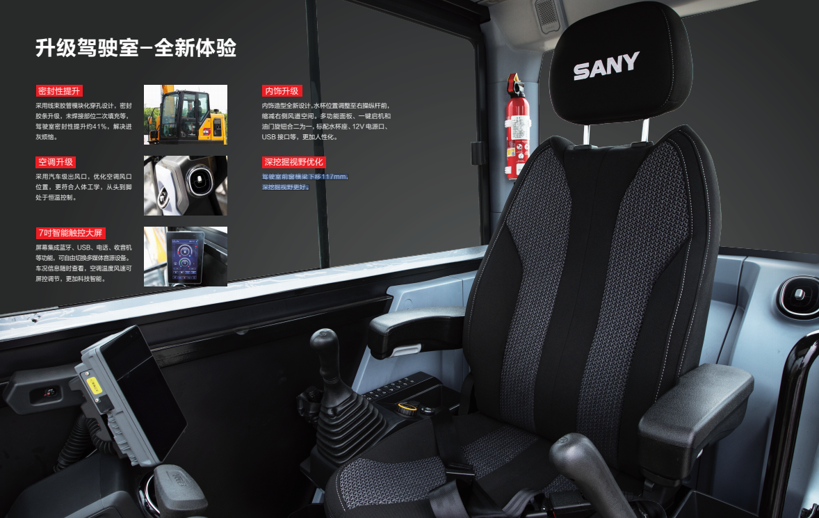 内饰升级:内饰造型全新设计,水杯位置调整至右操纵杆前,缩减右侧风道空间。多功能面板、一键启机和油门旋钮合二为一,标配水杯座、12V电源口、USB接口等,更加人性化。