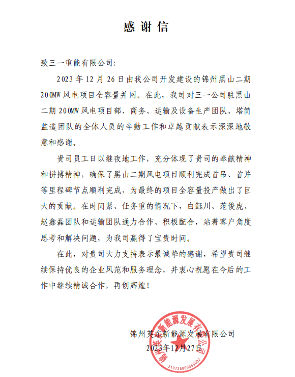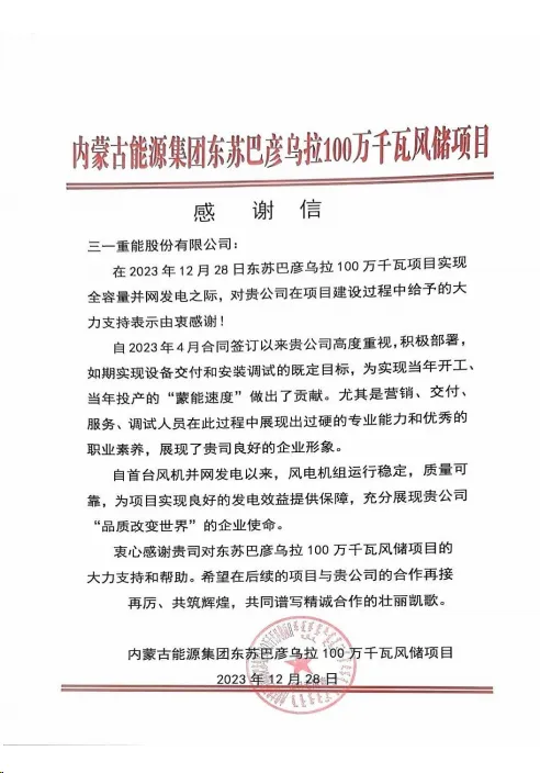 “自2023年4月合同签订以来贵公司高度重视,积极部署,如期实现设备交付和安装调试的既定目标,为实现当年开工、当年投产的“蒙能速度”做出了贡献。尤其是营销、交付、服务、调试人员在此过程中展现出过硬的专业能力和优秀的职业素养,展现了贵司良好的企业形象。自首台风机并网发电以来,风电机组运行稳定,质量可靠,为项目日后实现良好的发电效益提供保障,充分展现贵公司‘品质改变世界’的企业使命。”内蒙古能源集团业主在感谢信中说到。项目建设过程中,好体育投注官网重能团队全力以赴,积极保障项目如期并网发电。