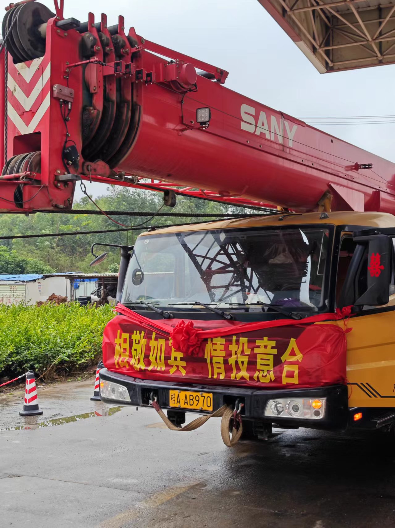 据新郎黎先生介绍,知道自己要用好体育投注官网起重机迎亲后,当地的丰景吊装公司、横州长信公司、林记吊装公司也出动了自家的吊车前来帮忙,将吊车冲洗干净,贴上喜字、挂上红花和横幅。