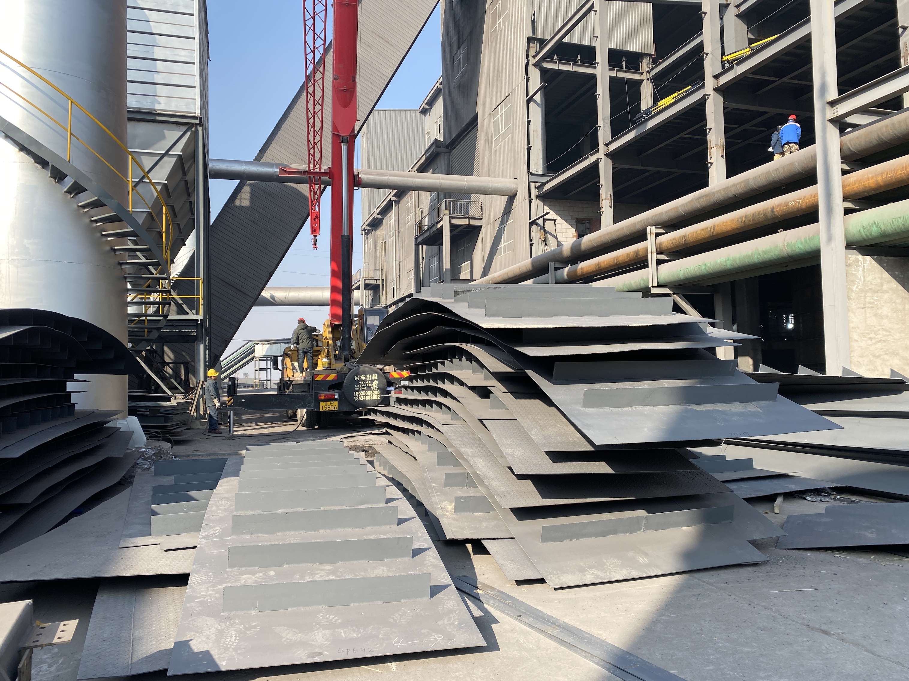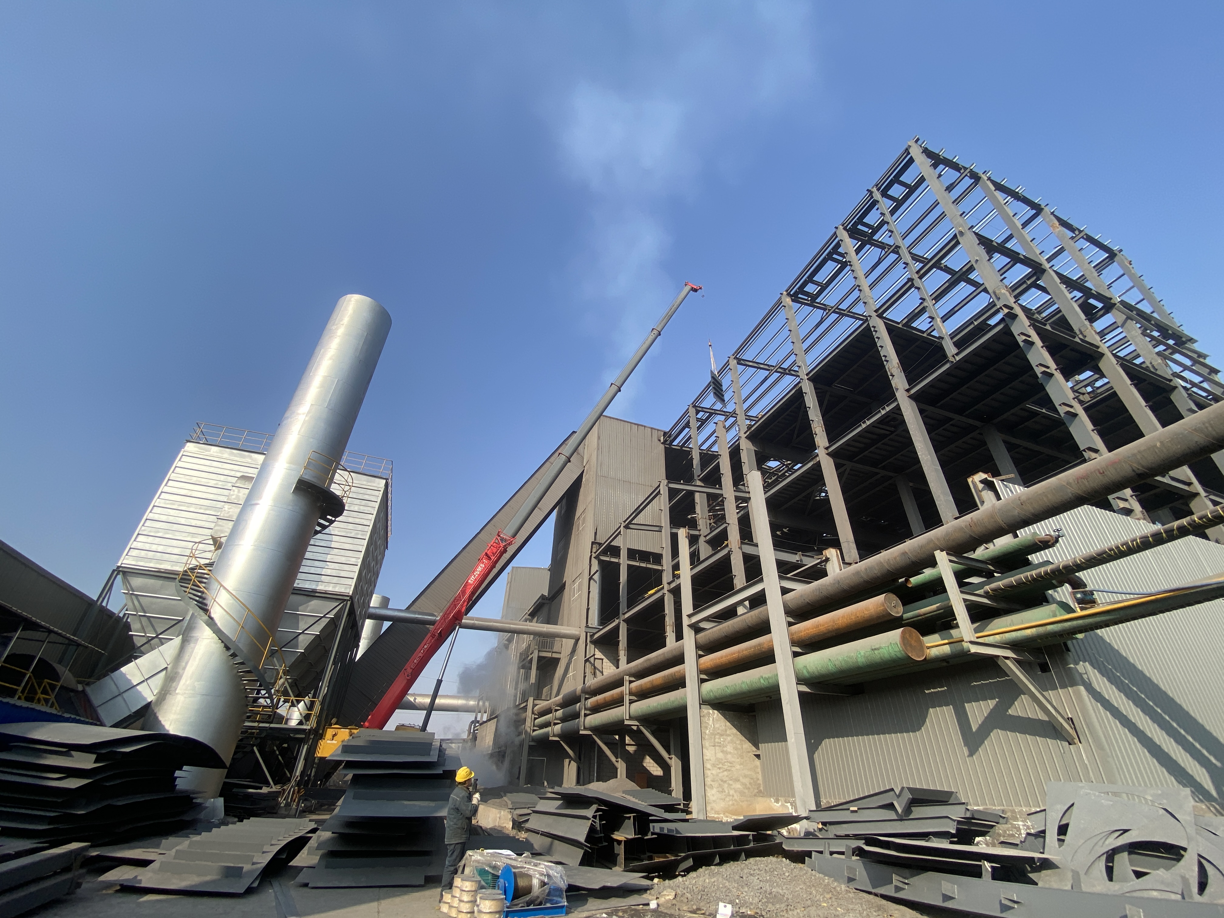 直到2024年1月,这台STC250E5-1插电起重机的机会来了。设备被安排在定襄当地的新材料科技公司厂区做钢结构吊装。