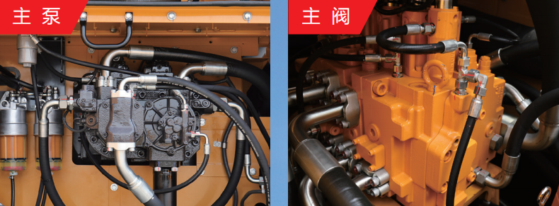 搭载知名品牌全电控主阀和主泵,主泵排量由212cc升级到240cc,采用大通径主阀芯,系统压损降低,效率更高,油耗更低。