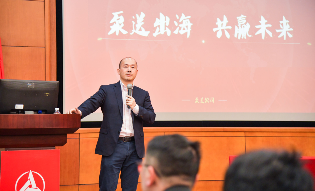出征现场,泵送公司全体员工与出征将士一起,齐声高喊出征口号:泵送出海,共赢未来!现场声量铿锵有力、气势高昂。海外产品经理毛志兵先生作为代表,上台发表出征感言。
