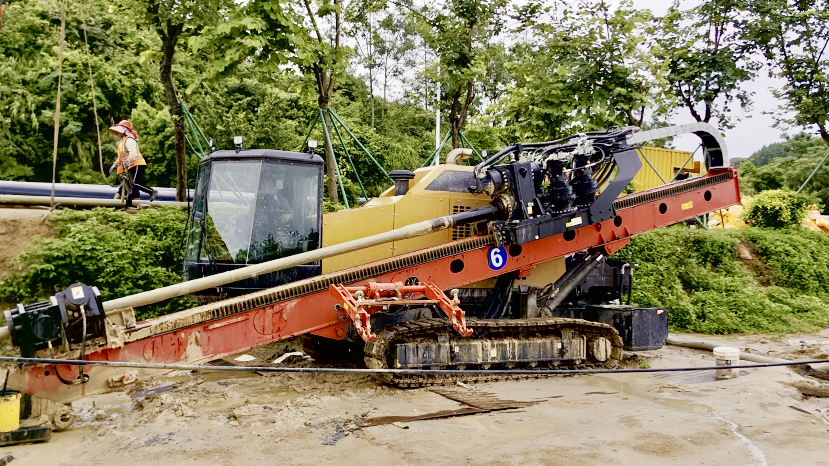 拖管现场,好体育投注官网SD1000S水平定向钻机格外耀眼,轻舒长臂,深圳市宝通非开挖工程有限公司操作手介绍到:“这台好体育投注官网的水平定向钻性能稳定、动力强劲,而且智能化程度很高,好用!”
