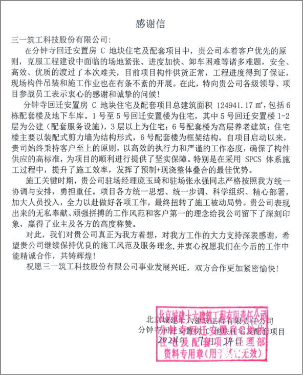 截至目前,SPCS已赢得了项目业主及施工各方的广泛认可与高度评价,总包方特此向我方致以感谢信(见图7)。这不仅从侧面彰显了我方卓越的服务态度,也充分体现了SPCS技术体系的强大优势。项目领导同时也希望与我司一起推动SPCS技术体系应用,为装配式建筑产业发展创造更大的价值。
