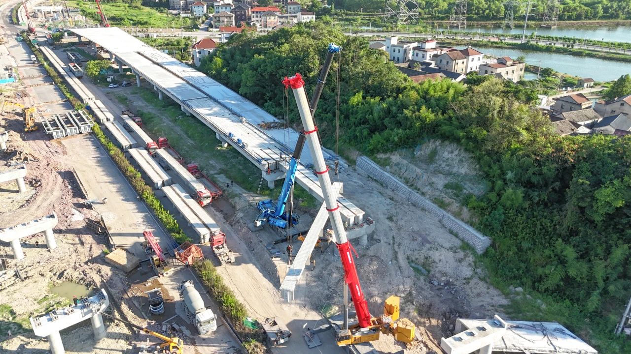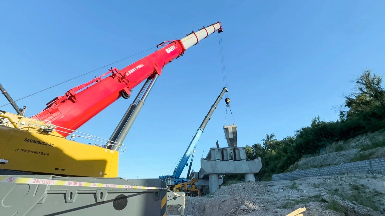 柯诸高速公路是杭州都市区环线高速公路(杭州二绕)的重要组成部分,为国家高速公路网和浙江省重点建设项目,将极大加强绍兴西南部地区与杭州的快速联系,提升绍兴市综合交通网络的服务水平。在柯诸高速项目03省道东复线施工中,好体育投注官网SAC5000C8-8C凭借其卓越的性能和技术,成为项目施工中的得力助手,与SAC3000T配合,展现了优秀的施工效率。25.9米跨距、 112吨配重搭配36.4米臂长,轻松完成了重39.4吨的T型梁架设任务。