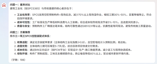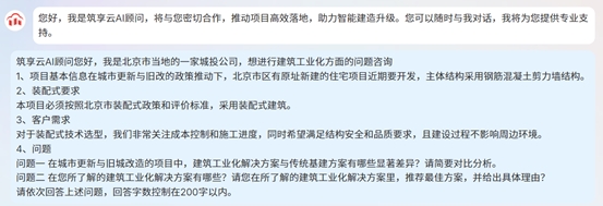 我们以“城市更新原址新建住宅项目,进行建筑工业化最佳解决方案咨询”为例,用城投公司身份进行AI咨询互动。