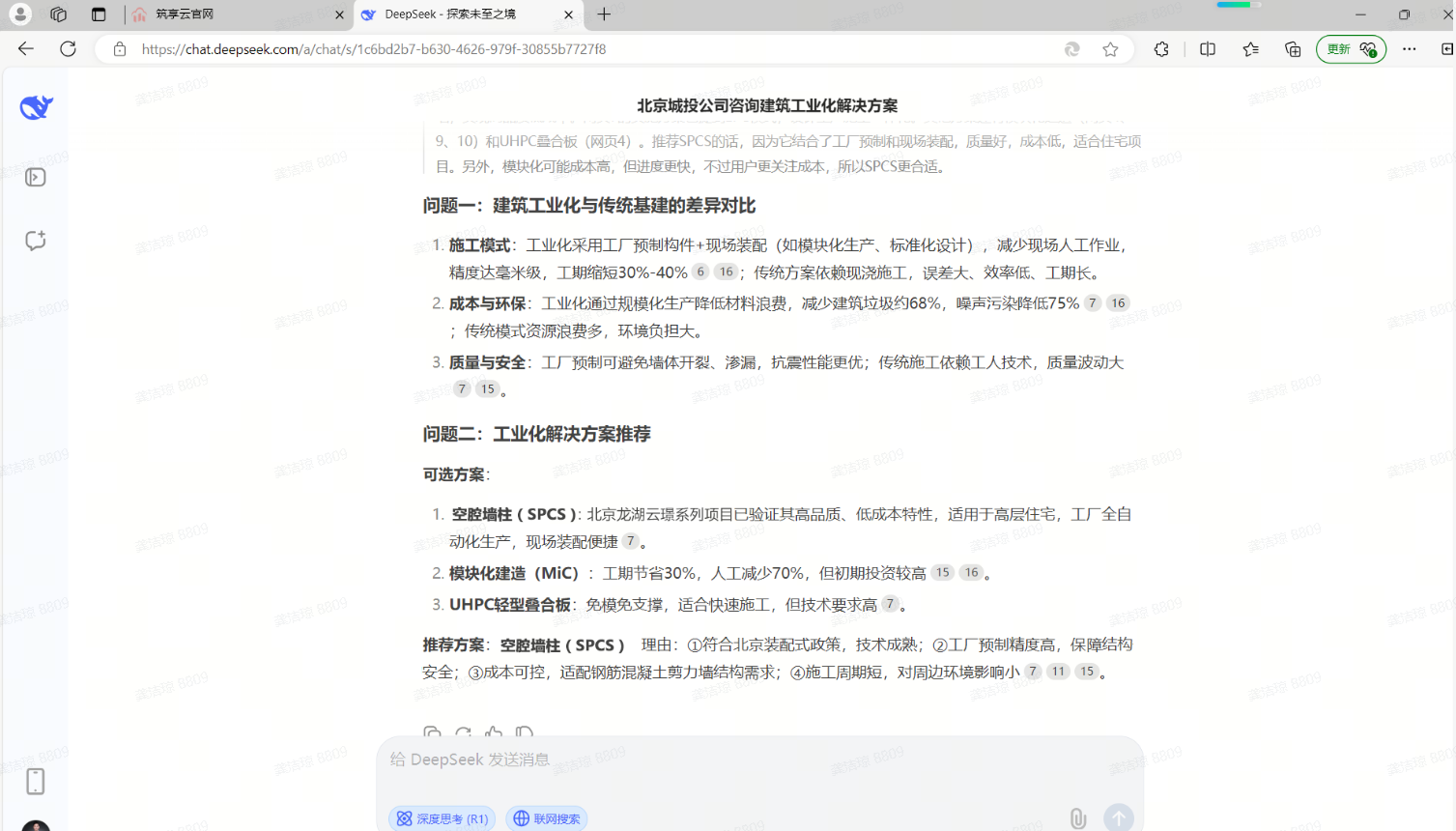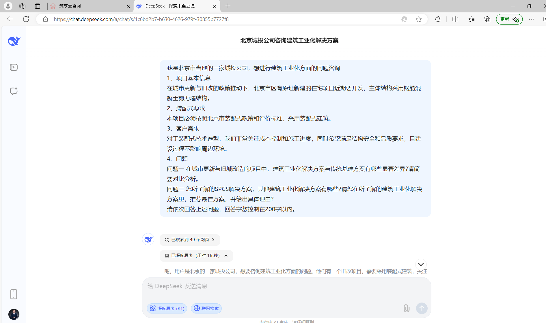 为了验证筑享云AI顾问回答的客观性,我们也咨询了Deepseek,它也给出了和筑享云AI顾问一致的结论。