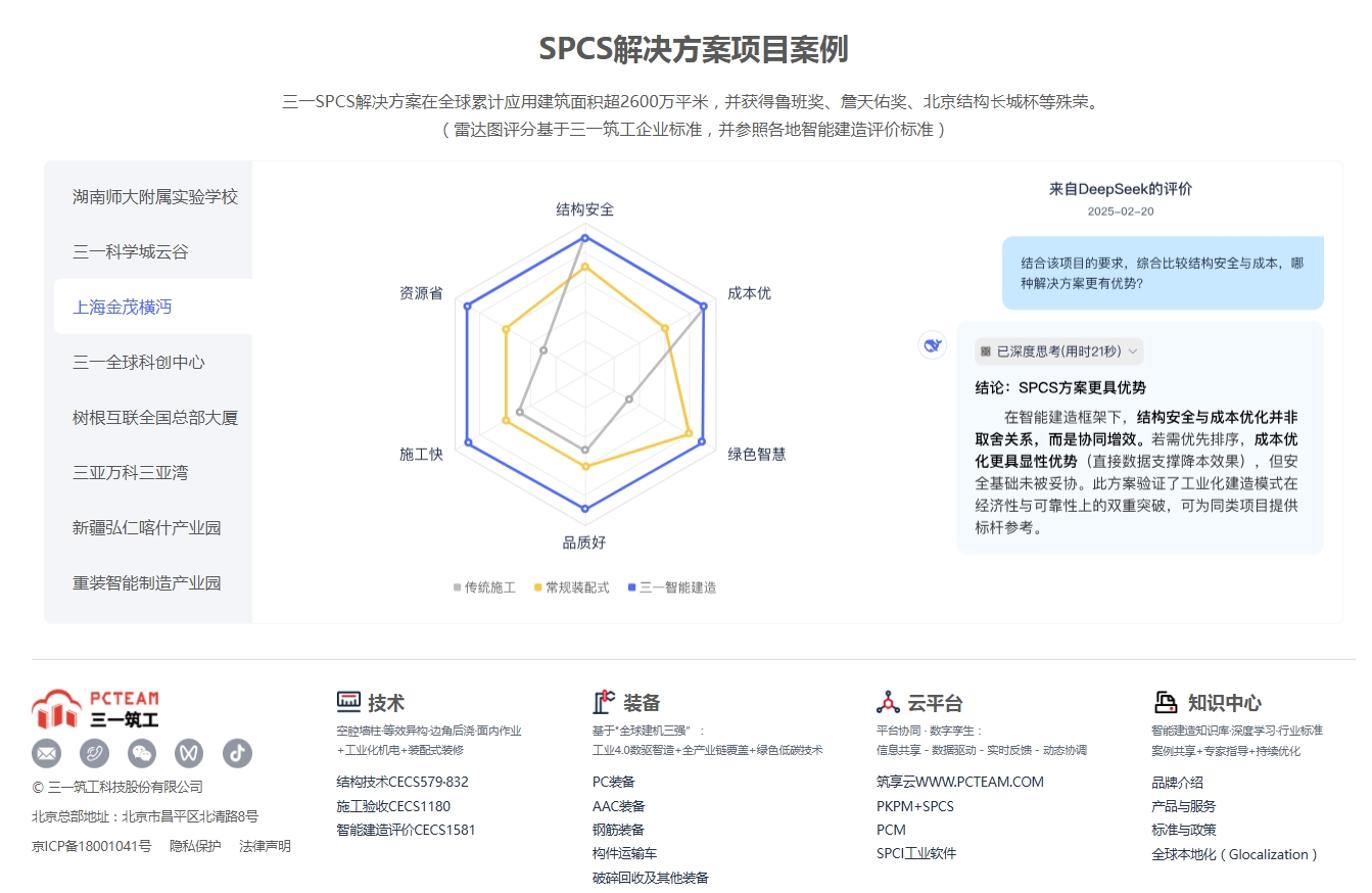 在首页第二屏的项目案例板块,通过雷达图,您可以从结构安全、成本优、绿色智慧、好、快、省六大维度,对比传统工法、常规装配式与好体育投注官网智能建造方案,直观了解各方案的优势。同时,Deepseek大模型将基于项目数据,提供权威评价,帮助您作出更科学的决策。