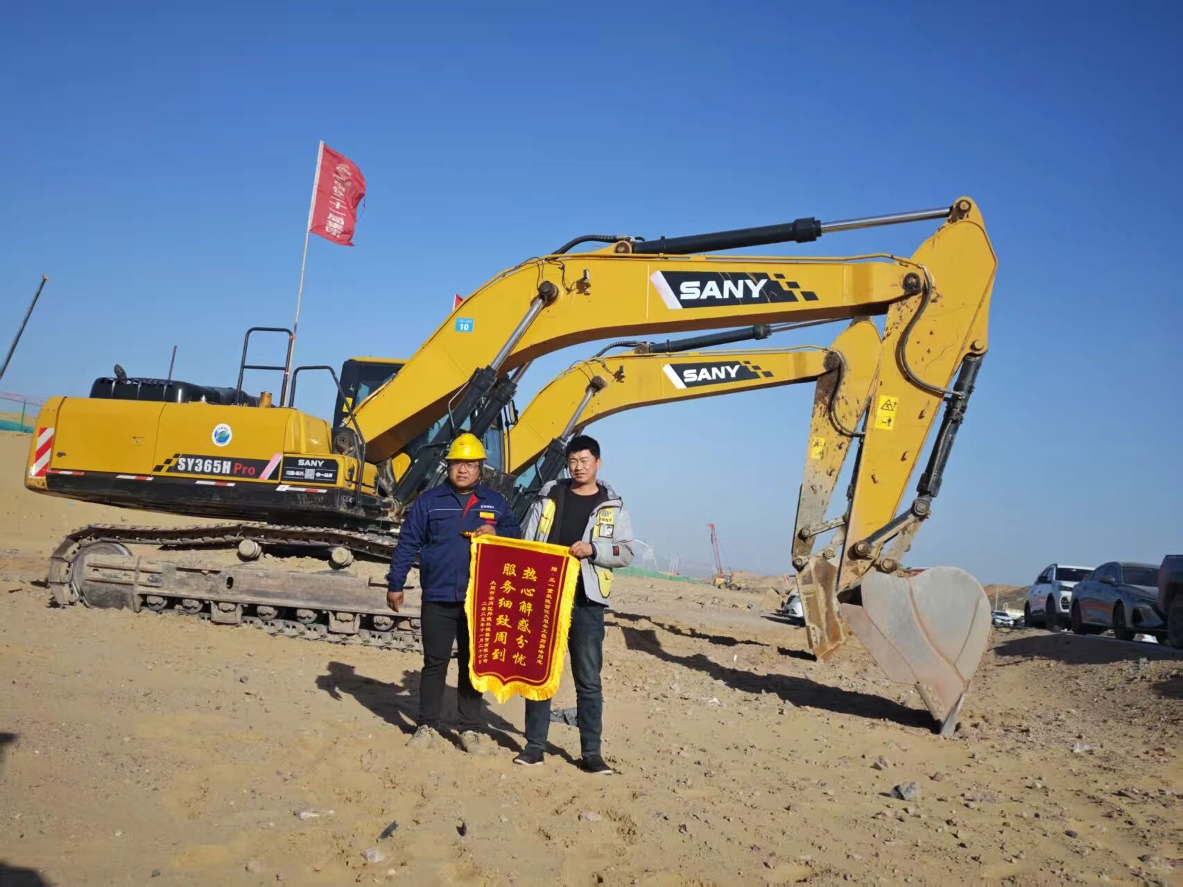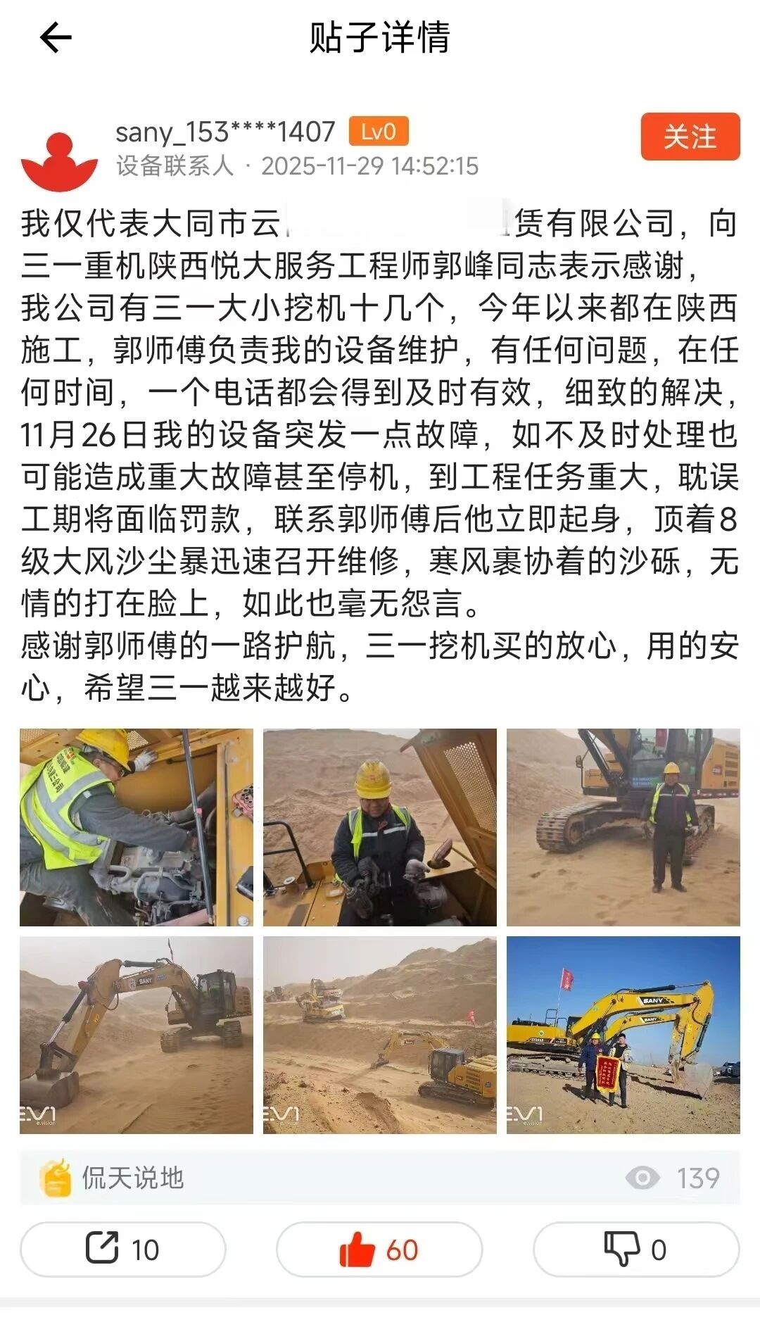 客户几次想上前帮忙,都被郭峰婉言劝回。半个多小时后,当郭峰站起身时,浑身已被沙尘裹满,嘴唇干裂得渗出血丝。随着挖机轰鸣响起,散热风扇平稳运转,危机成功化解,郭峰才长长舒了口气,露出疲惫却欣慰的笑容。“这么大的风沙,你真是救了我的工期!” 客户紧紧握住他的手,感激之情溢于言表。郭峰从包里掏出保养手册,细心叮嘱:“矿区粉尘大,记得每周检查一次支架紧固情况,有任何问题,随时联系我!”