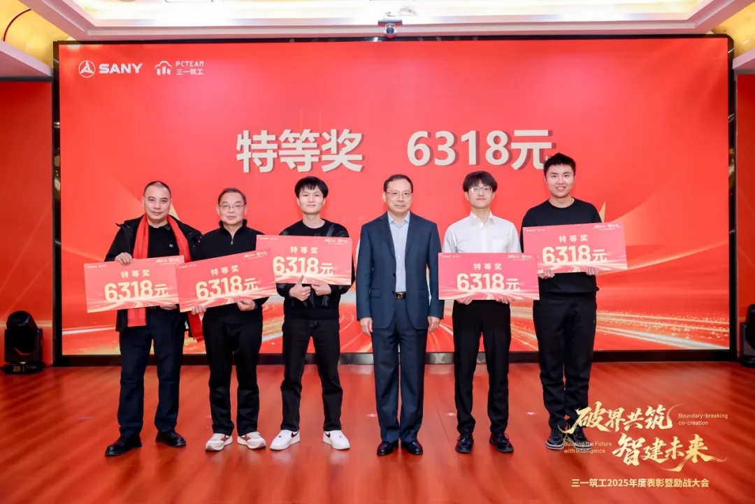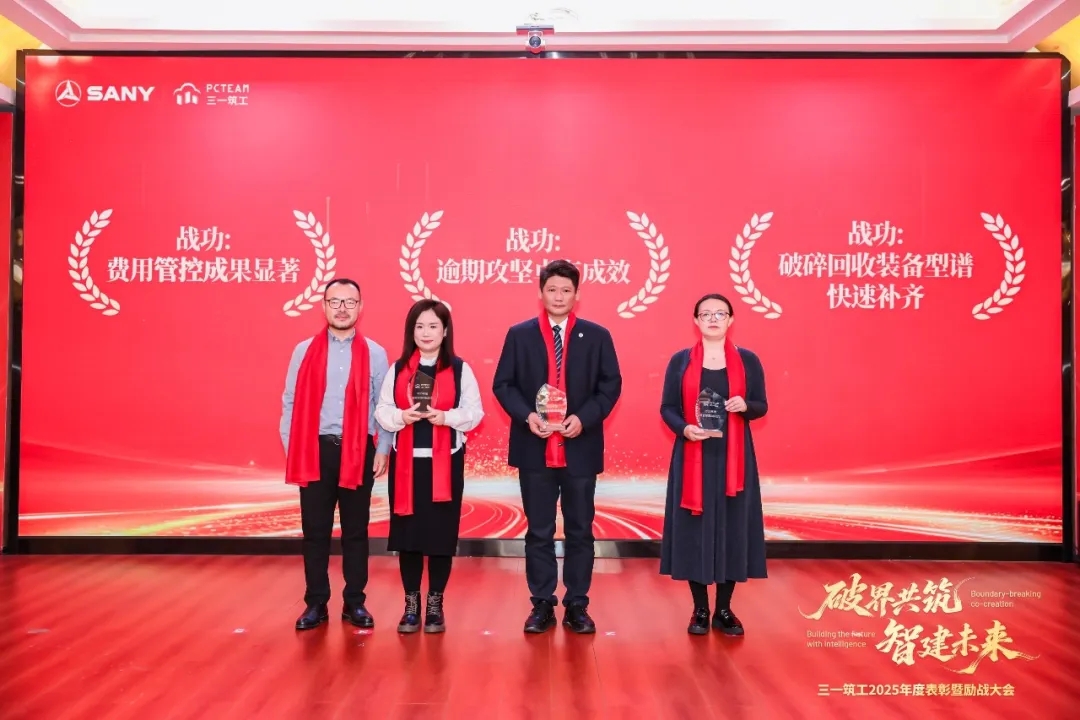A级战功颁奖环节,费用管控成果显著、逾期攻坚卓有成效、破碎回收装备型谱快速补齐、海外市场跨越式增长、PC工厂经营业绩全面扭亏、破碎回收装备制造交付能力显著提升——六大战功团队依次登台,接受属于他们的荣耀。