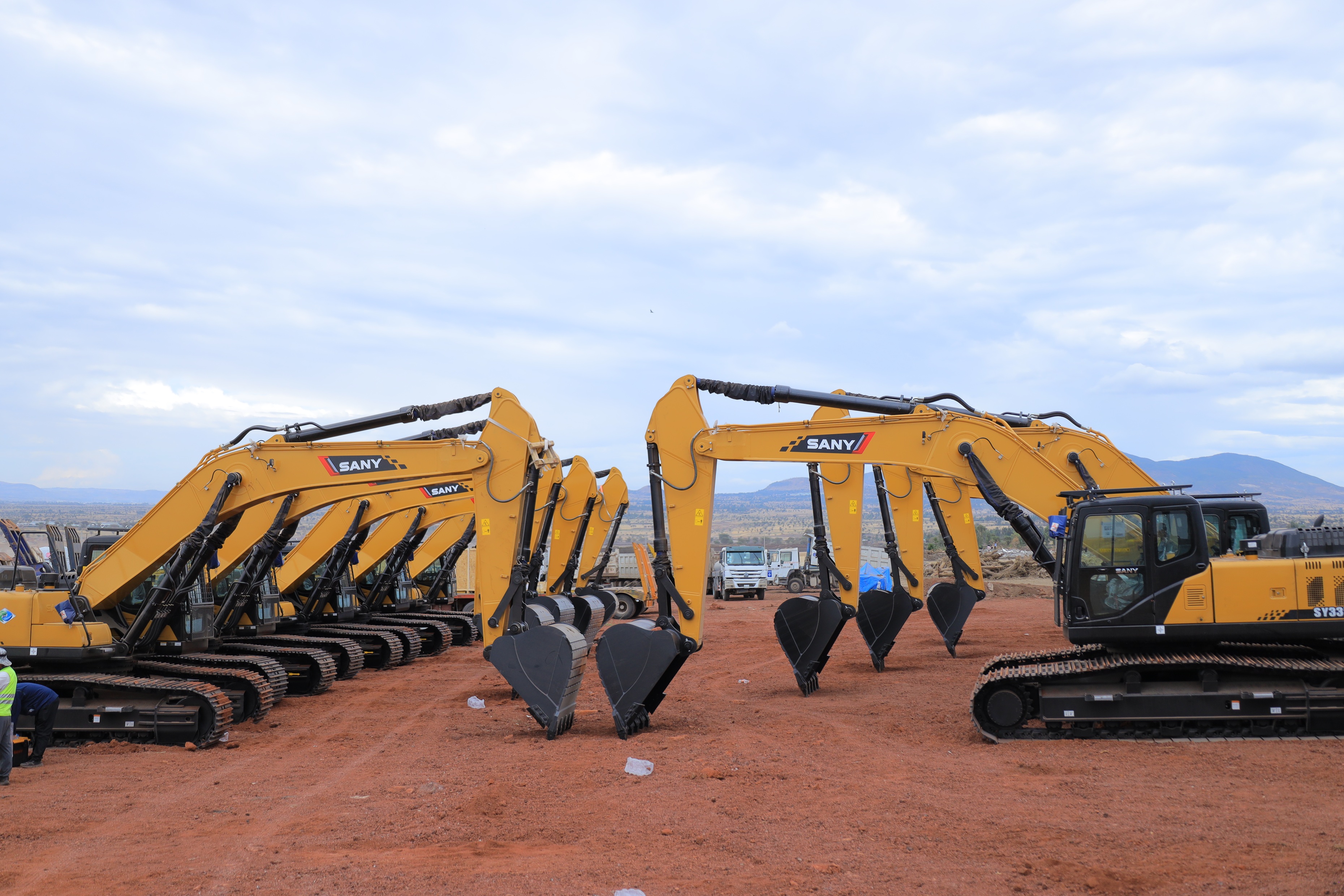 3月8日,10台好体育投注官网SY335C挖掘机顺利运抵埃塞俄比亚比绍夫图国际机场项目现场,正式交付中交一公局埃塞新机场项目。