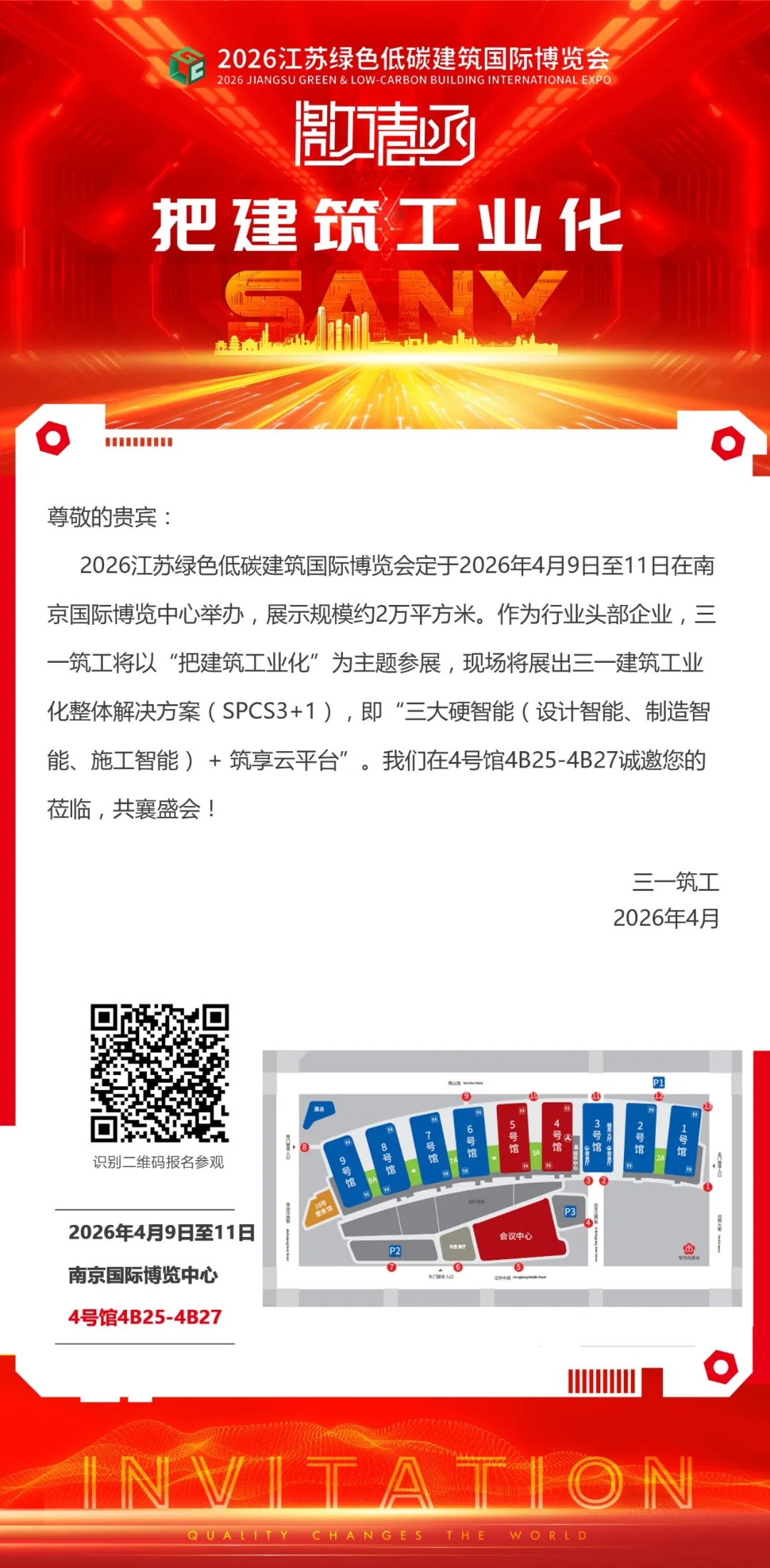 2026江苏绿色低碳建筑国际博览会定于2026年4月9日至11日在南京国际博览中心举办,展示规模约2万平方米。作为行业头部企业,好体育投注官网筑工将以“把建筑工业化”为主题参展,现场将展出好体育投注官网建筑工业化整体解决方案(SPCS3+1),即“三大硬智能(设计智能、制造智能、施工智能) + 筑享云平台”。我们在4号馆4B25-4B27诚邀您的莅临,共襄盛会!