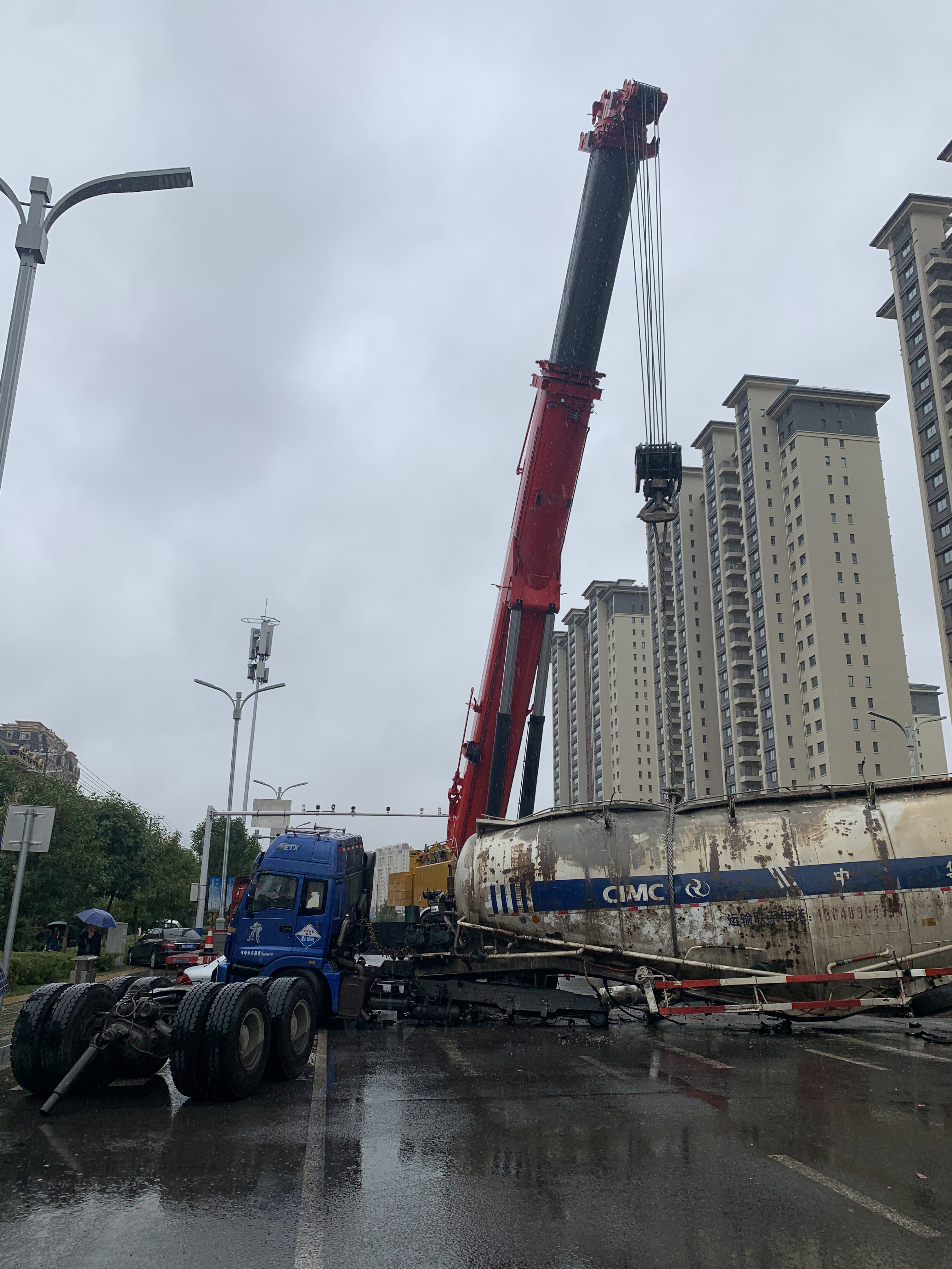 “我在现场指挥两台车用吊绳穿过水泥罐车底部,模仿自锁式扎带进行吊载,防止打滑。但由于罐体与地面紧紧贴合,钢丝绳无法穿过去,需要先吊起一头让罐体与地面有缝隙,再穿过钢丝绳,但这样有罐体开裂的风险。经过讨论,现场安排了一名电焊师傅随时待命,罐体只要有一点点缝隙,就立马进行焊接。弄完一边再弄另一边,光是定吊点都花了2个多小时。”