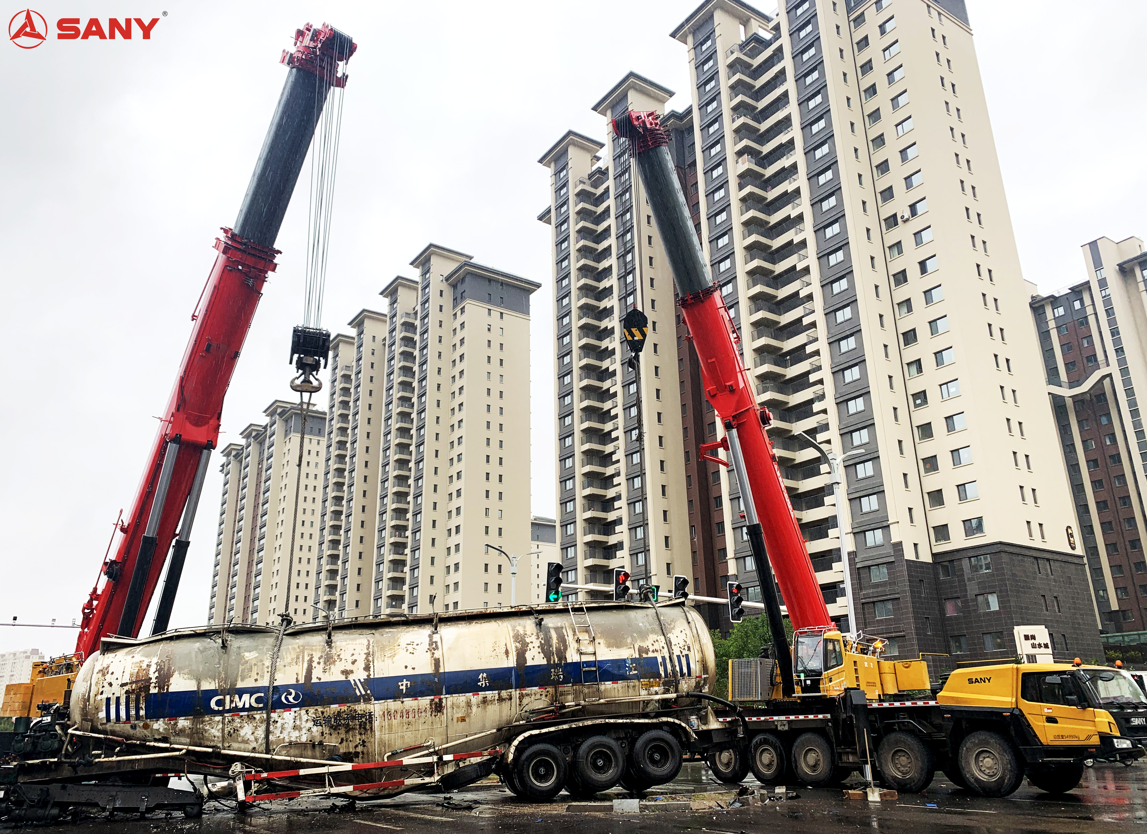 水泥罐车很旧,里面的水泥有上百吨,吊点困难、物体超重,现场救援有一定难度。如果吊点设计不好,就会把罐体勒断裂 ,引发二次事故。为此,交通指挥部门要求救援设备动作精确、稳定安全。