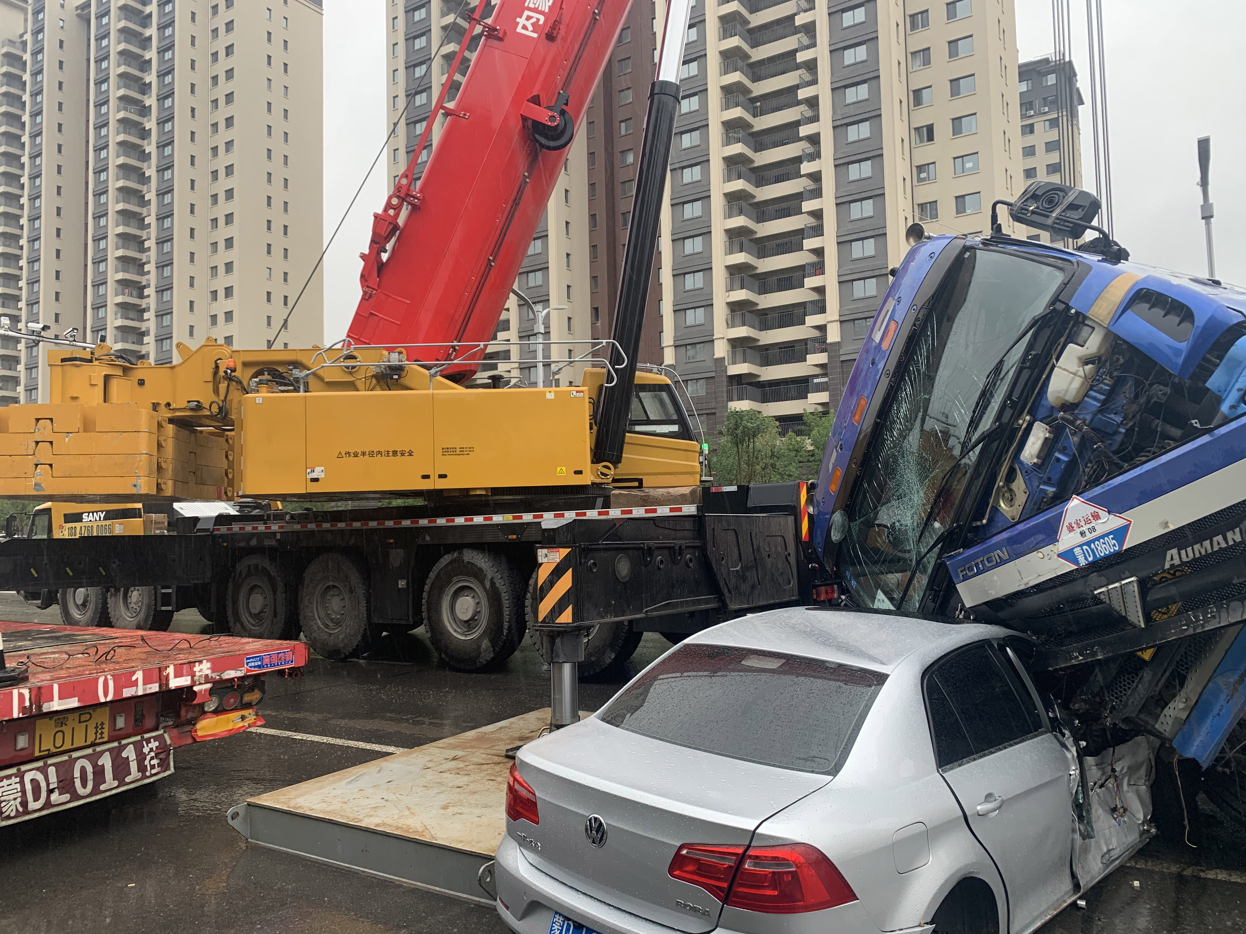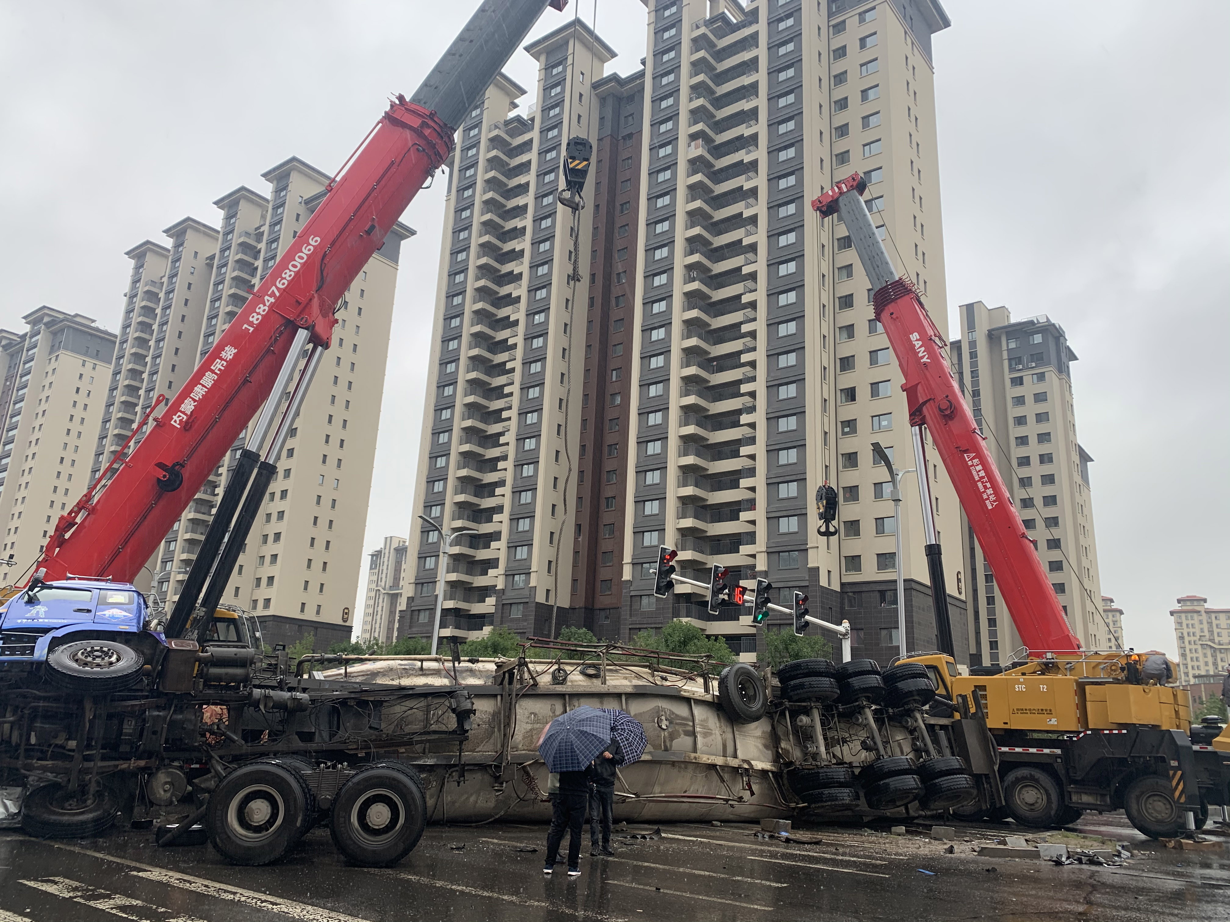 9月20日上午6时,内蒙古赤峰啸鹏吊装有限公司张雷接到求助电话:“赤峰市铁南大街南段十字路口发生了车祸,一辆私家车和水泥罐车发生碰撞,水泥罐车侧翻在路口,造成交通严重堵塞。”放下手机,张雷意识到情况十分紧急,当即联系韩志杰,调动SAC4500T和STC1000T2两台起重机赶往现场。