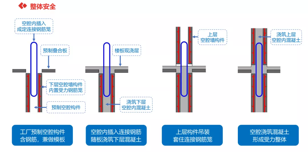 SPCS剪力墙采用“空腔预制构件+搭接钢筋+现浇叠合混凝土”,“空腔+搭接+后浇”是一种“工业化现浇”的过程,它既保留了传统现浇的做法,整体安全,防水性能好,品质高,又用工业化生产的方式,提升了生产效率,降低了建造成本。