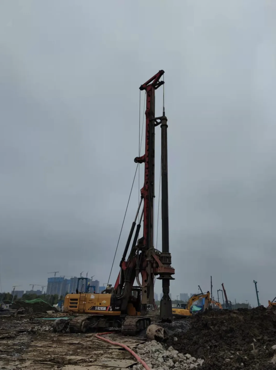 四川宜宾全球最大动力电池生产基地:时代吉利项目,其上部地层为杂填土,下部为强-中风化灰色泥岩,地下水较发育。由于任务重,工期紧,场地上共有40台旋挖钻机进行桩基础施工。令人遗憾的是,部分旋挖在使用双底捞砂斗钻进时,由于每天成桩数量十分有限,在试桩结束后被劝退离场。